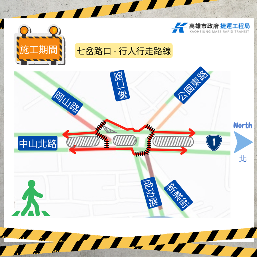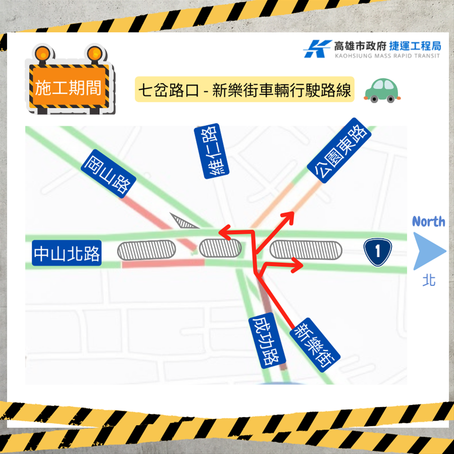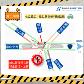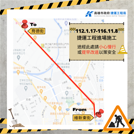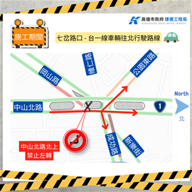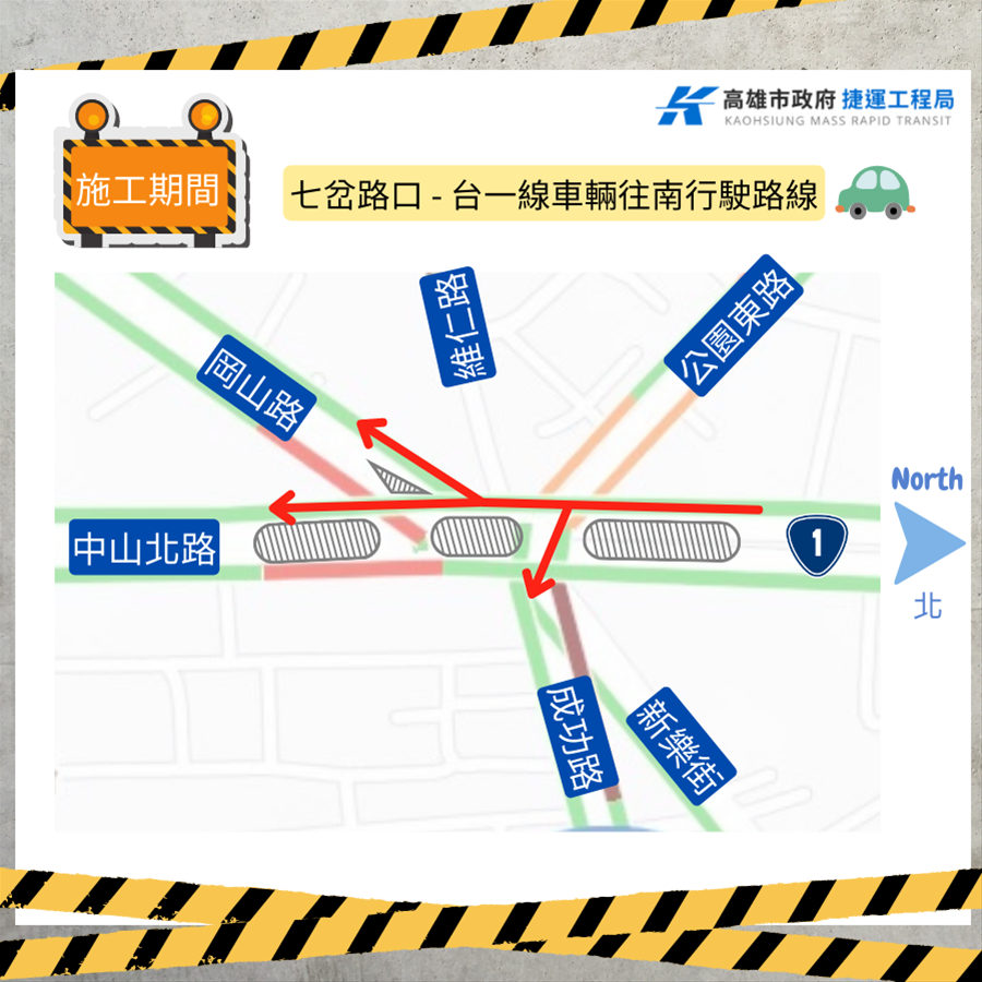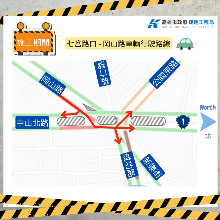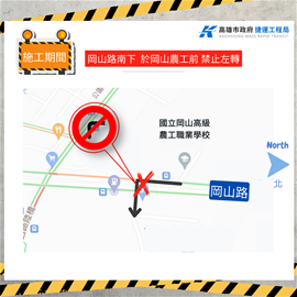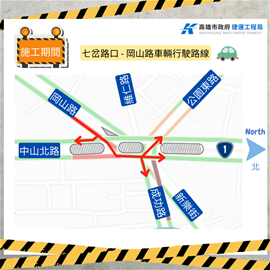 省道台1線因捷運岡山路竹延伸線第2A階段圍籬架設及基樁試樁工程,施工期間從112年1月17日起至116年11月8日,目前圍設範圍從公園東路延伸至岡山農工前,因進行基樁試樁施工所以南北向車道皆會縮減,預計占用2快車道,為降低工程施工對用路人的影響,現場各路口皆有配置義交指揮交通,請行經車輛注意義交指揮及施工標誌,減速小心慢行。