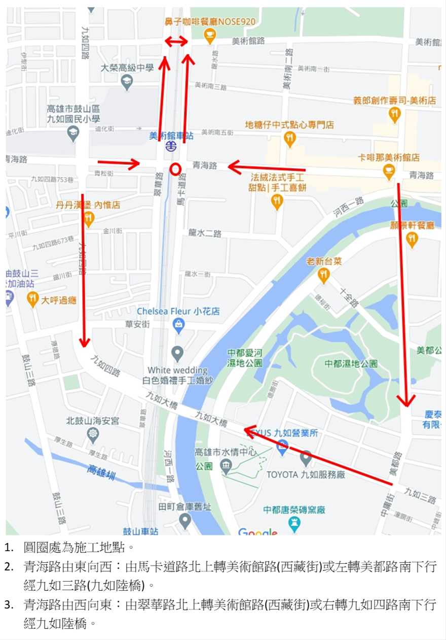 施工期間如有經過該路口,敬請減速慢行,依指揮人員導引通過,造成諸多不便望祈諒解。另為節省用路人寶貴的時間,捷運工程局建議可提前改道或行駛其他替代道路如美術館路(西藏街)、九如三路(九如四路)。建議改道詳細路線,詳如附圖說明。