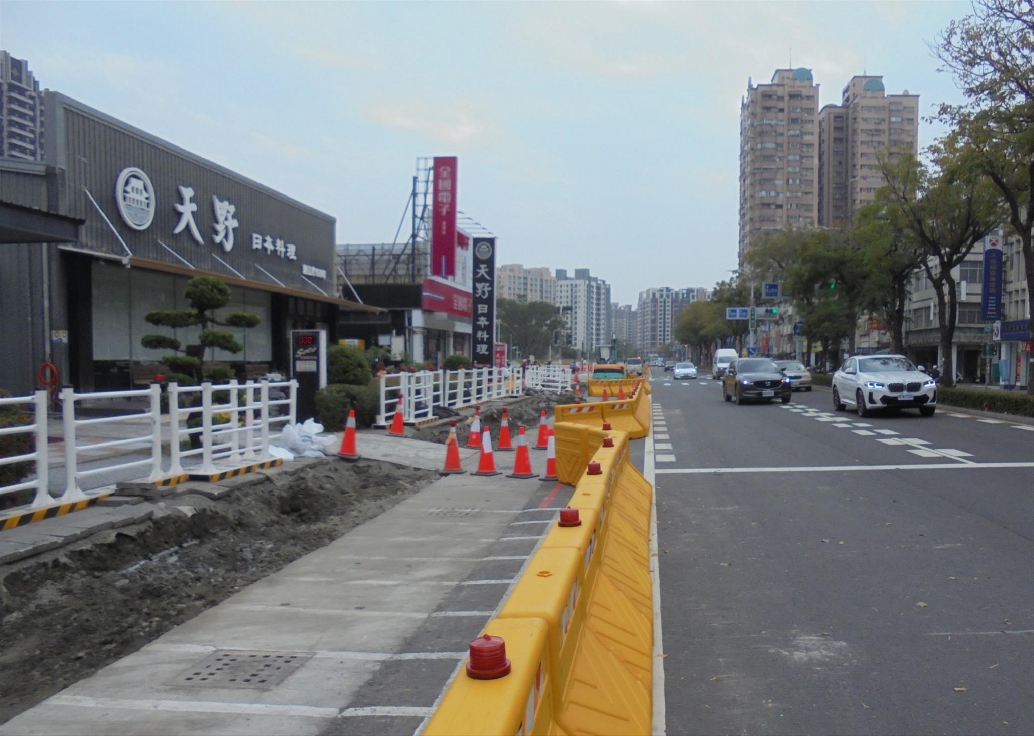 各階段施工前依交維計畫設置交維措施,主要以型鋼護欄及紐澤西護欄阻隔工區,並配置義交協助指揮交通,施工區域會留設行人通道供民眾通行。