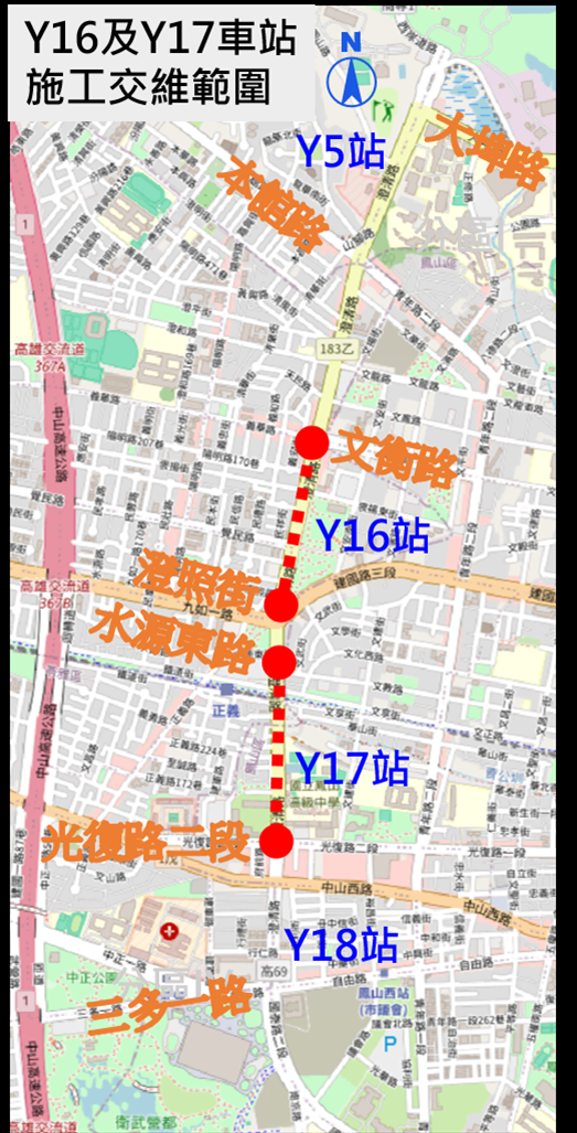 捷運黃線YC03標統包工程為因應後續主體工程施工交維改道需求,將於Y16及Y17車站前後交維範圍內進行兩側人行道及分隔島削減工程,說明如下: