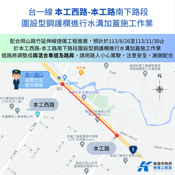 「高雄都會區大眾捷運系統岡山路竹延伸線第二階段統包工程」施工單位將於岡山區台一線本工西路~本工路段南下車道,進行外側明溝加蓋施工作業,施工期間自113/8/26起至113/11/30止,該路段車道將配合調整成2混合車道及1公尺路肩,敬請行經該路段用路民眾小心駕駛,注意安全,謝謝配合~