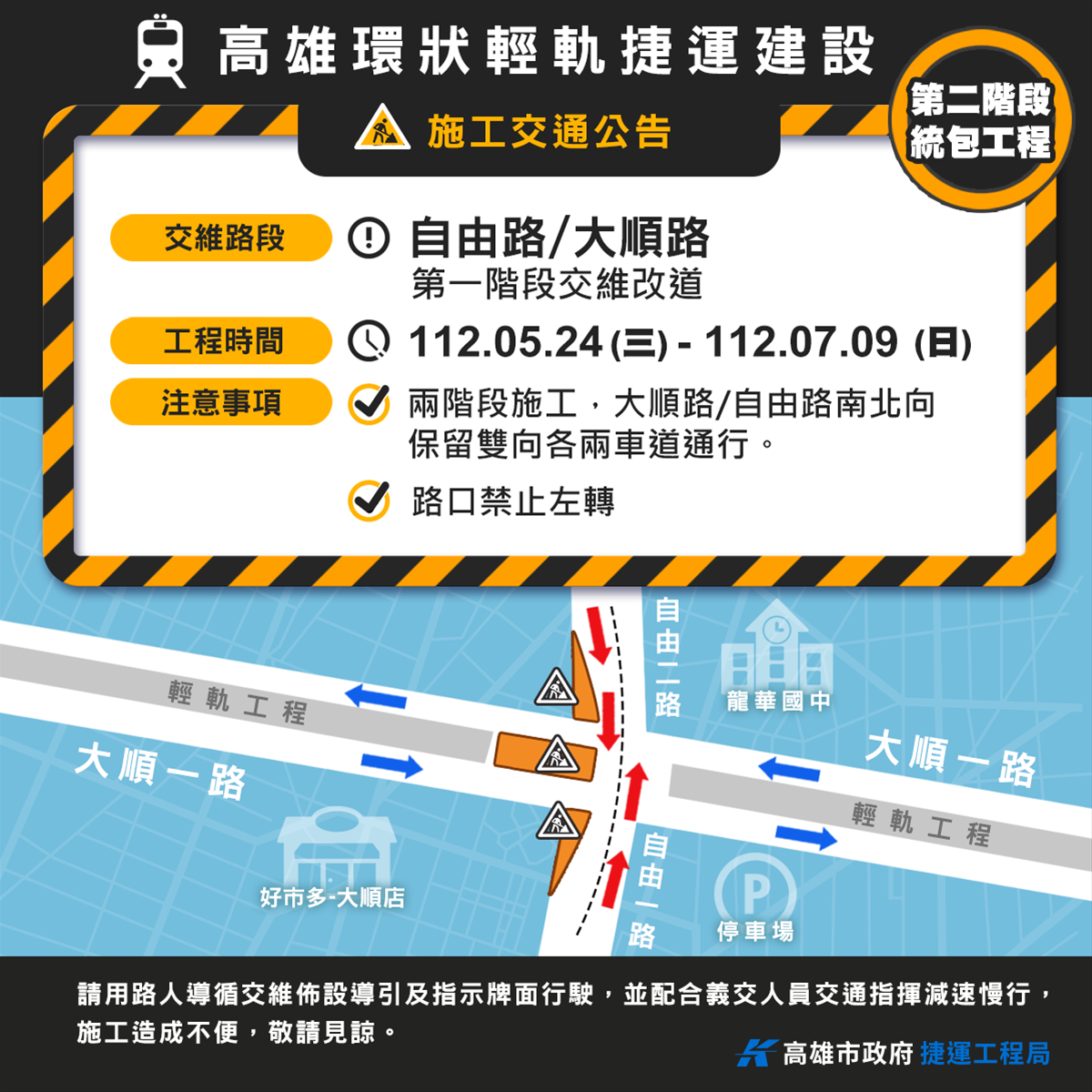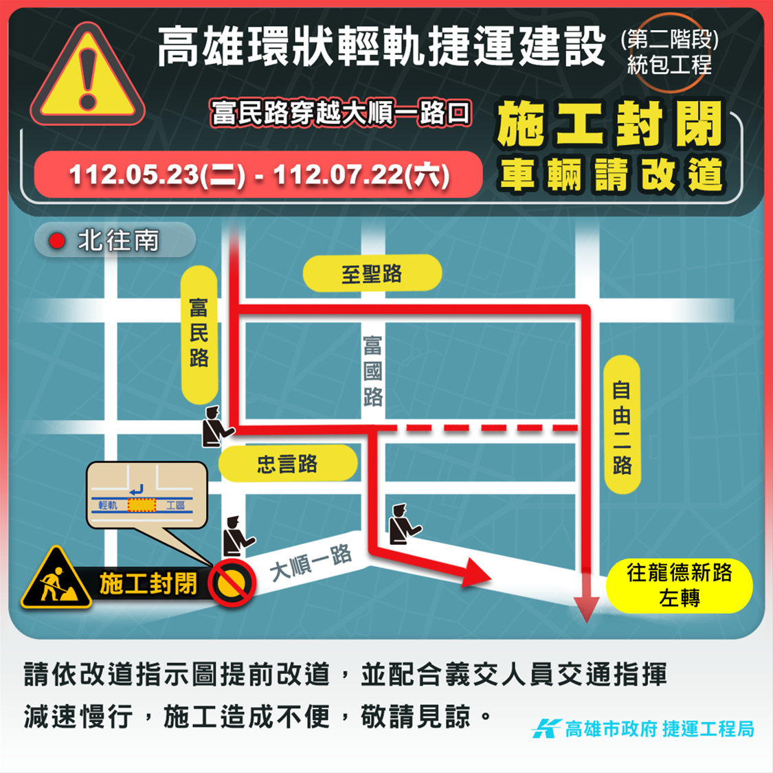 用路人駕駛車輛經過大順路輕軌施工路段,請依工區速限30km減速慢行,並依標誌、標線指引及交通指揮人員導引通行,確保行車安全,或提早改道行駛其他替代道路(建議路線詳附圖),以節省用路人寶貴的時間,施工期間造成諸多不便望祈諒解。