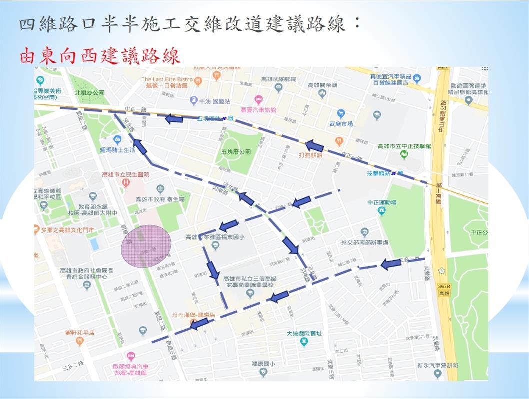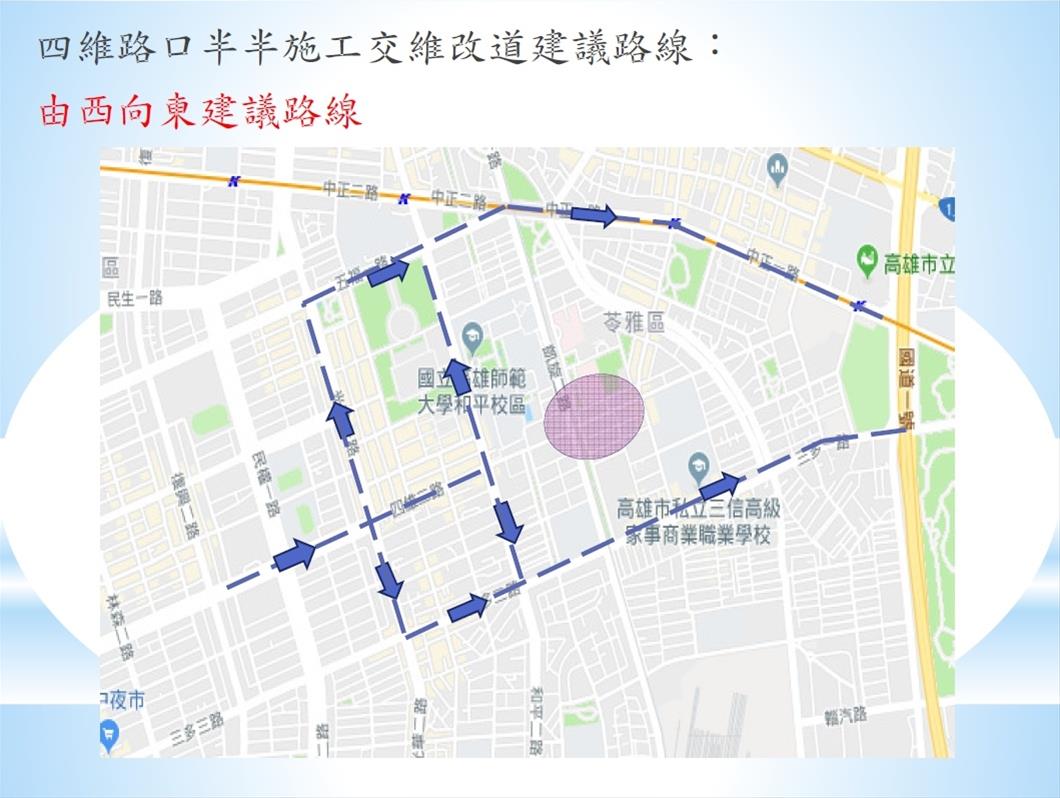 施工期間如有經過該路口,敬請減速慢行並禁止左轉,依指揮人員導引通過,造成諸多不便敬請諒解。另為節省用路人寶貴的時間,捷運工程局建議可提前改道或行駛其他替代道路如三多路與中正路。建議改道詳細路線,詳如附圖說明。