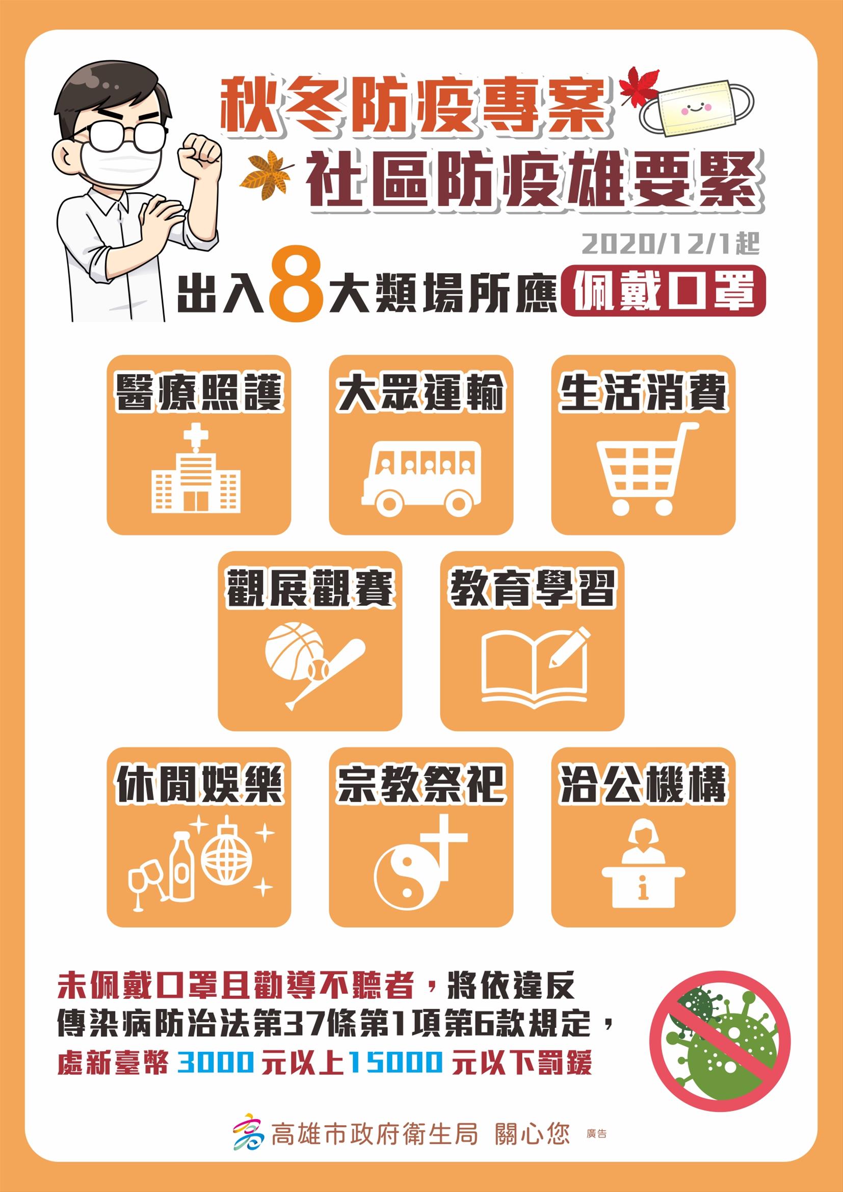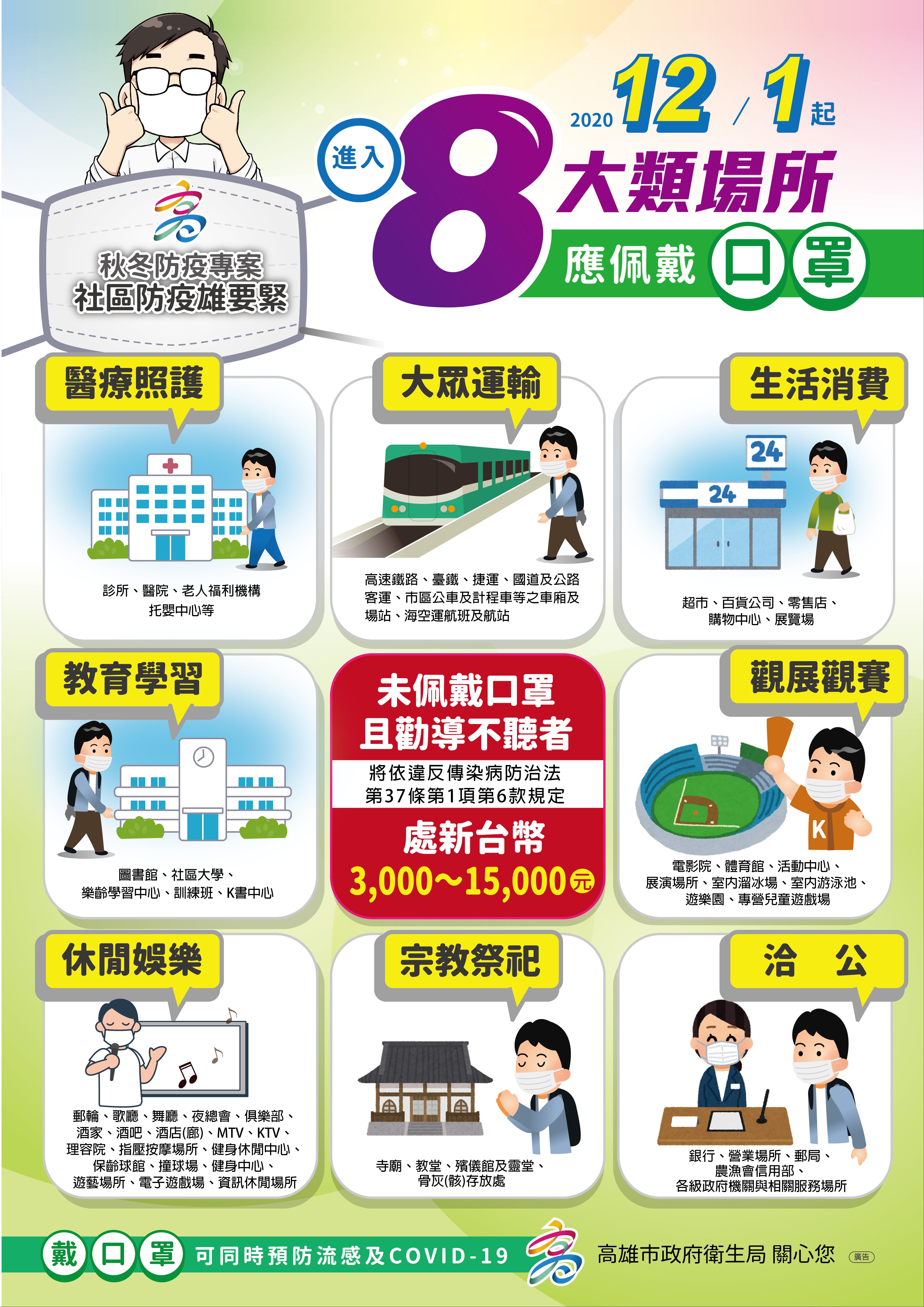 12月1日起出入8大類場所應配戴口罩,8大場所包含醫療照顧、大眾運輸、生活消費、觀展觀賽、教育學習、休閒娛樂、宗教祭祀及洽公機關,未佩戴口罩且勸導不聽者,將依違反傳染病防治法第37條第1項第6款規定,處新臺幣3000元以上15000元以下罰鍰。