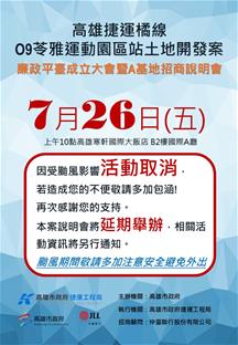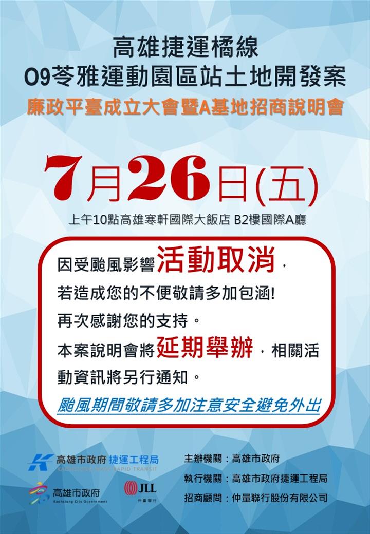 原訂7月26日上午10點舉辦「高雄捷運橘線O9站土地開發案廉政平臺成立大會暨A基地招商說明會」,因颱風因素取消並延期辦理,相關資訊將另行通知。