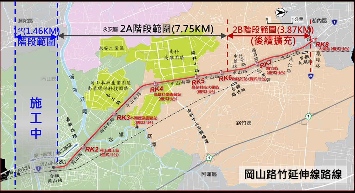 捷運岡山路竹延伸線第2A階段土建暨軌道工程範圍起於第一階段岡山車站向北(不含)行經岡山農工(RK2)、本洲產業園區(RK3)、南科高雄園區(RK4)、高苑科技大學(RK5)、南路竹(RK6),長約7.75公里。第2B階段為後續擴充,範圍由路竹站(RK7)止於大湖站(RK8),長約3.87公里。全線採高架設置,總長約11.62公里。
