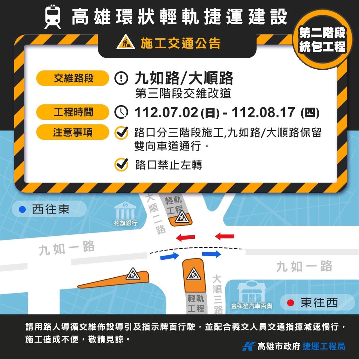 「高雄環狀輕軌捷運建設(第二階段)統包工程」九如/大順路口第二階段交維施工提前於112年6月29日完成,捷運局規劃自112年7月2日至8月17日計47天,進行第三階段交通維持改道作業。因應本階段交維計畫,交維設施範圍為大順路/九如路口南側,路口保留雙向車道通行,請駕駛人行經施工路段時務必依循交維佈設導引及指示牌面行駛。