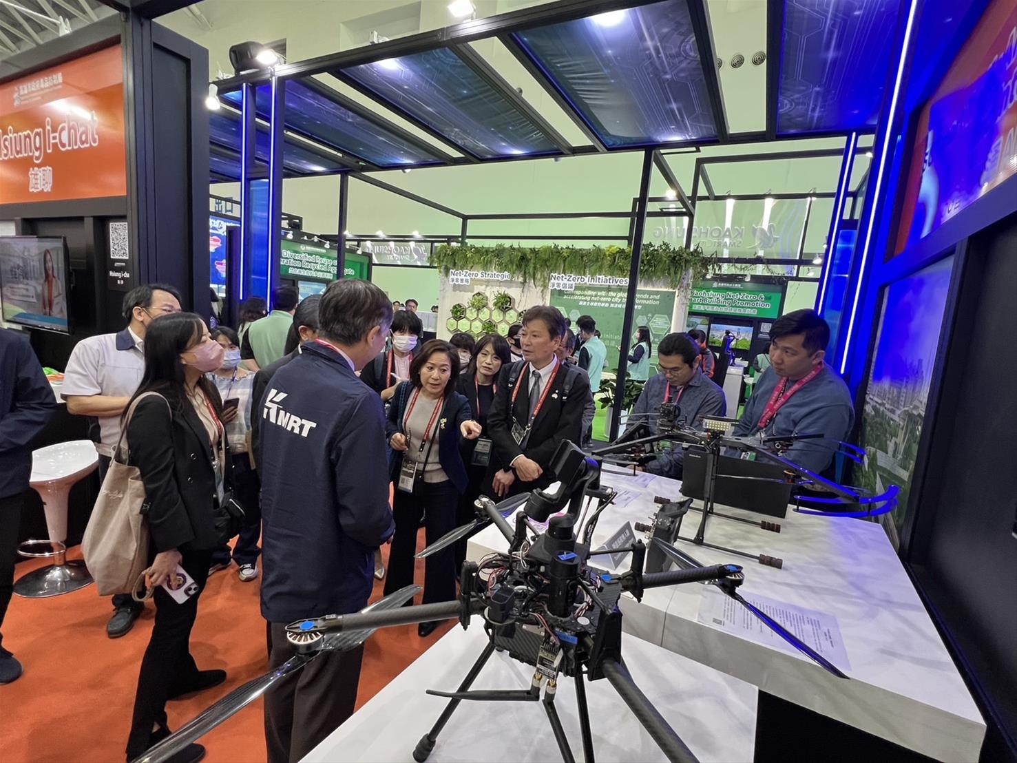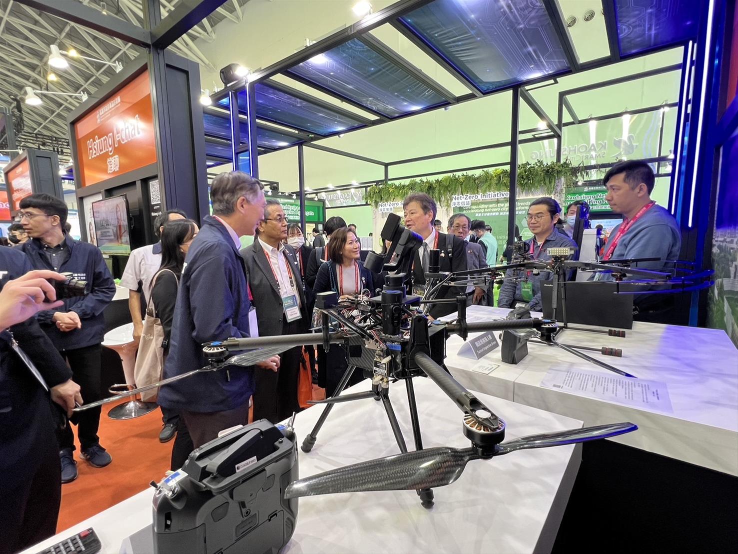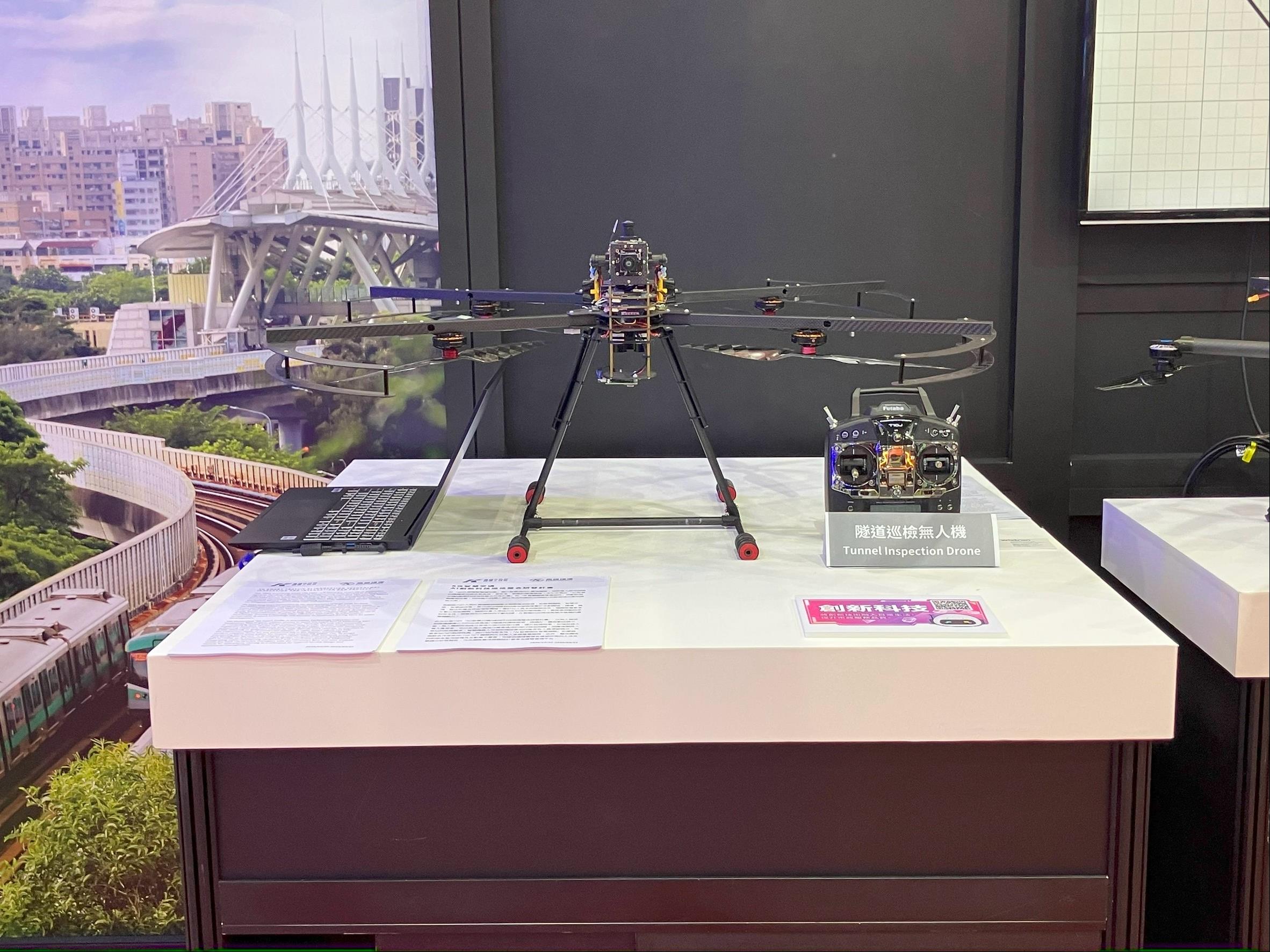 捷運局所展示的「5G智慧交通AI創新科技巡檢整合研發計畫」,以無人機進行隧道與橋樑檢測,透過AI一鍵自動巡檢功能,無人機即可完成日常或災後的巡檢任務,提升巡檢效率,加強巡檢人員人身安全,也以此減少高空作業車造成的空汙排放問題。