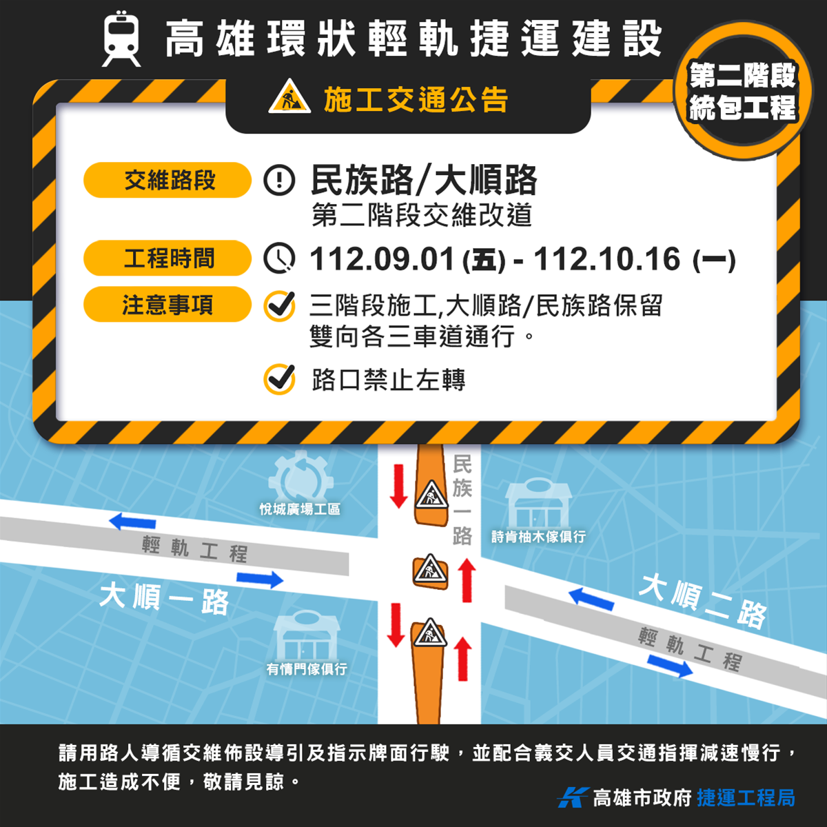 「高雄環狀輕軌捷運建設(第二階段)統包工程」大順一、二路與民族路口將分三階段施工,自112年9月1日起至112年10月16日將進行第二階段交通維持改道作業,交維設施範圍為大順路/民族路口中央(詳交維示意圖),路口保持雙向車道通行,請駕駛人行經該路口及施工路段時務必依循交維佈設導引及指示牌面行駛。