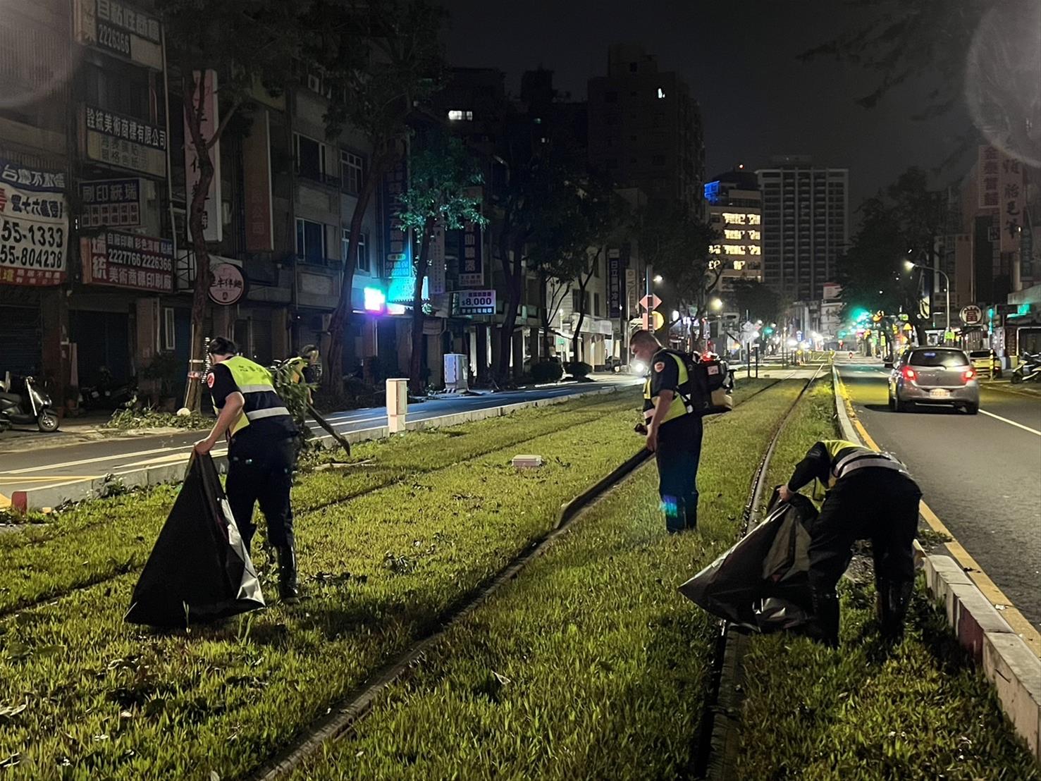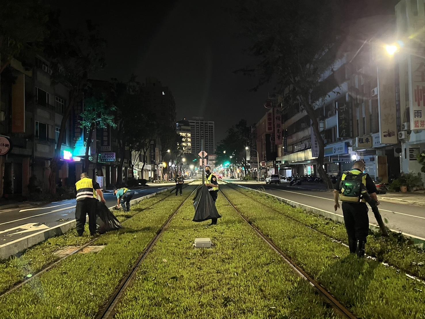 高捷公司於10月5日凌晨開始,深夜時刻到上午,總計投入動員65人以吹樹葉機,將樹葉集中並撿拾打包移除,等軌間落葉清除作業。