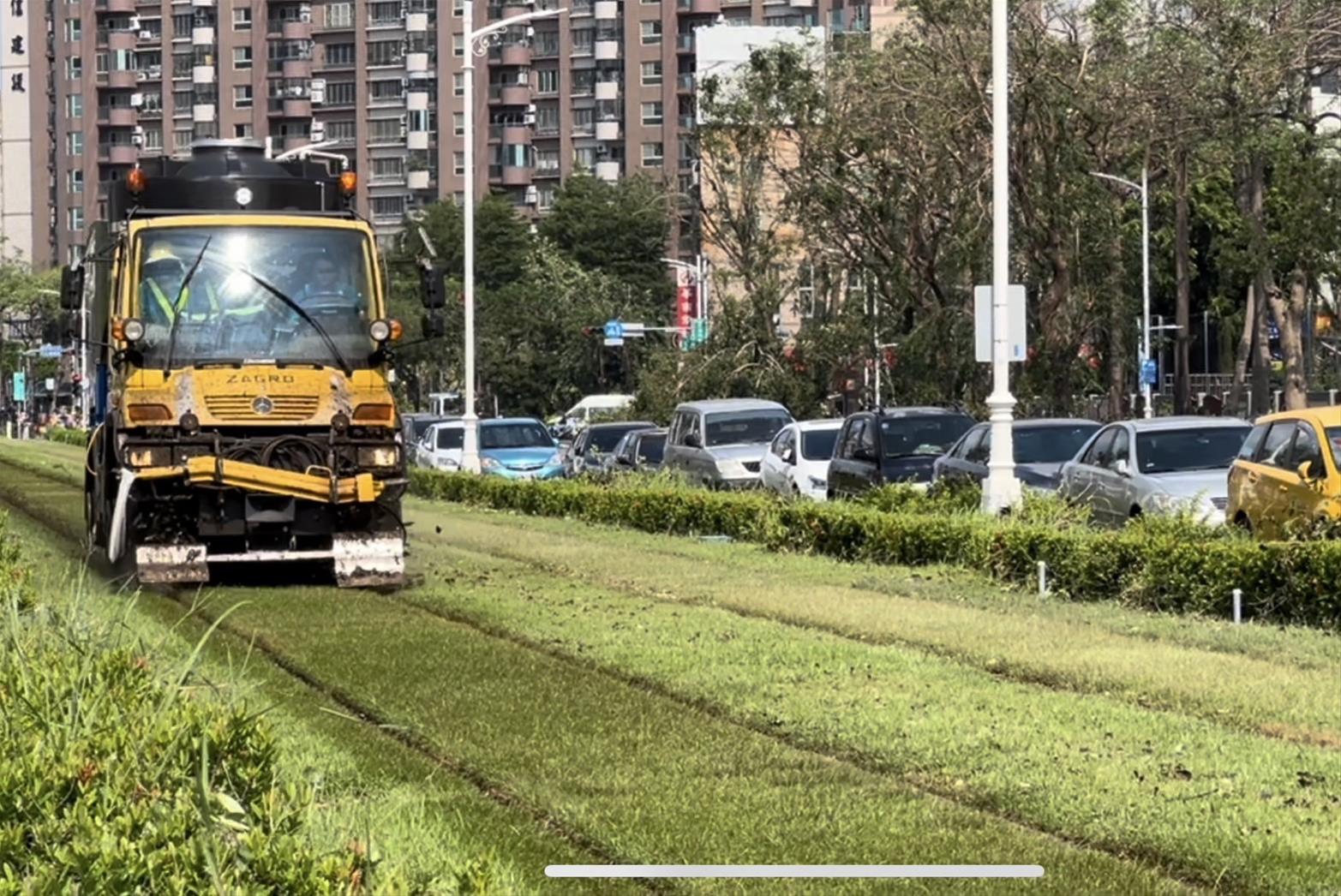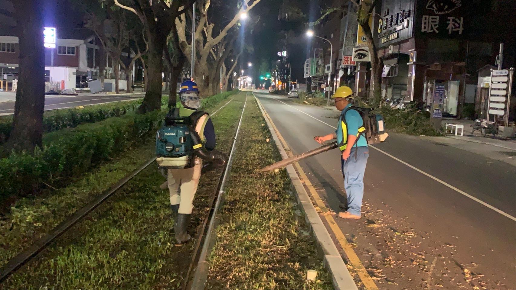 10月5日中午,以軌道高壓沖水車發進,徹底清理上下行軌道軌間殘存樹葉與濕泥;機廠維修人員通宵進行列車鋼輪洗滌,輕軌團隊恢復市容工作已48小時接力未間斷,為提供民眾穩定舒適的輕軌服務持續努力。