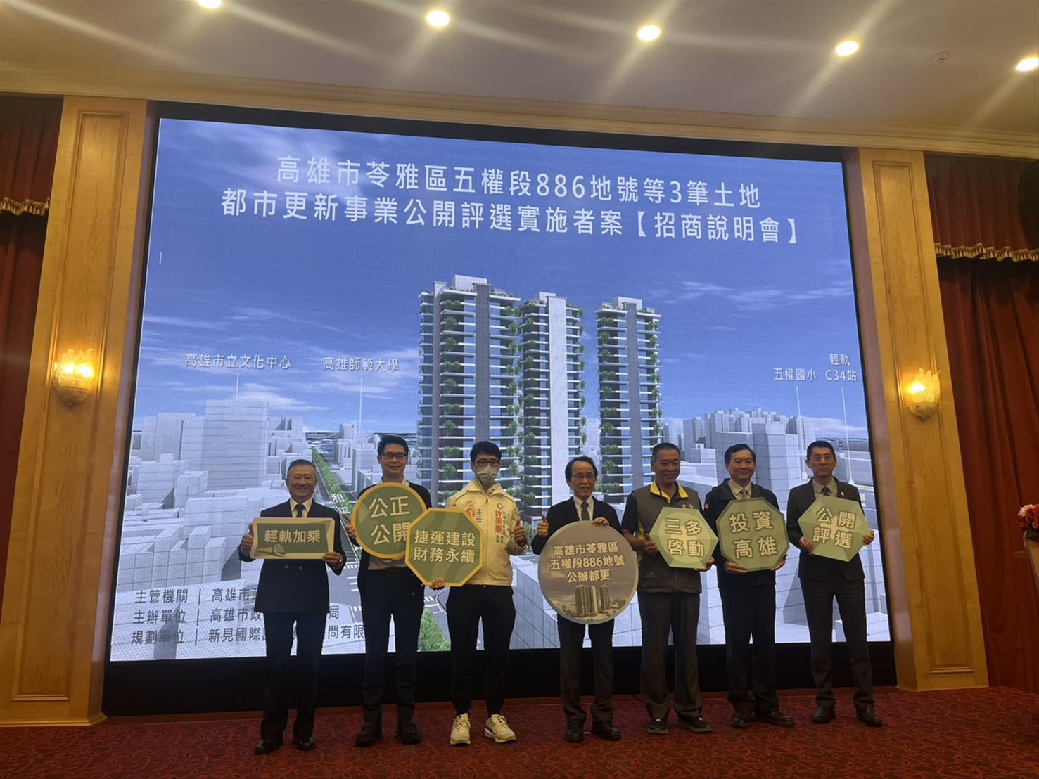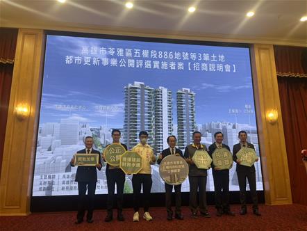 高雄市政府積極推動大眾運輸導向及促進都市更新,今(4/1)舉辦苓雅區五權段886地號都市更新案招商說明會,現場多家建設公司、資產管理機構及投資公會熱烈參與,各界踴躍詢問案情細節,本案是苓雅區首件公辦都市更新事業招商案,市府期望透過公私協力,將基地轉型為新藝文生活基地,透過捷運建設的連結提升區域通勤潛力,展現高雄宜居便捷的城市環境。