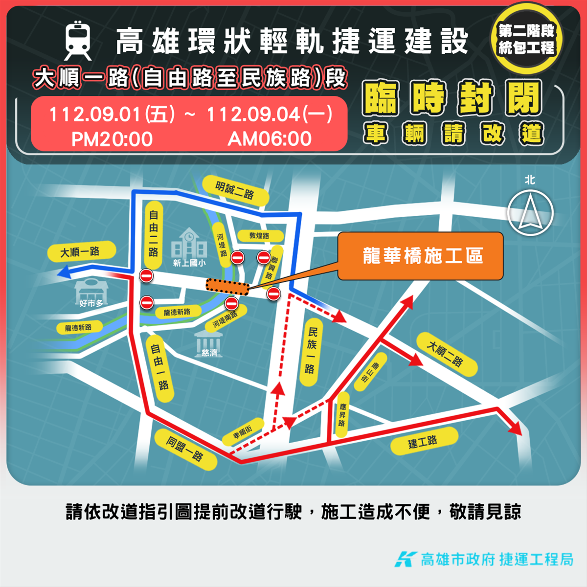 「高雄環狀輕軌捷運建設(第二階段)統包工程」預計9月1日(五)夜間20時起至9月4日(一)清晨6時止臨時性全天候封閉大順一路(自由路~民族路間)東西雙向車道,進行「龍華橋新橋台鋼結構橋梁安裝工程」,施工完成後將恢復現有交通維持設施及車道通行。