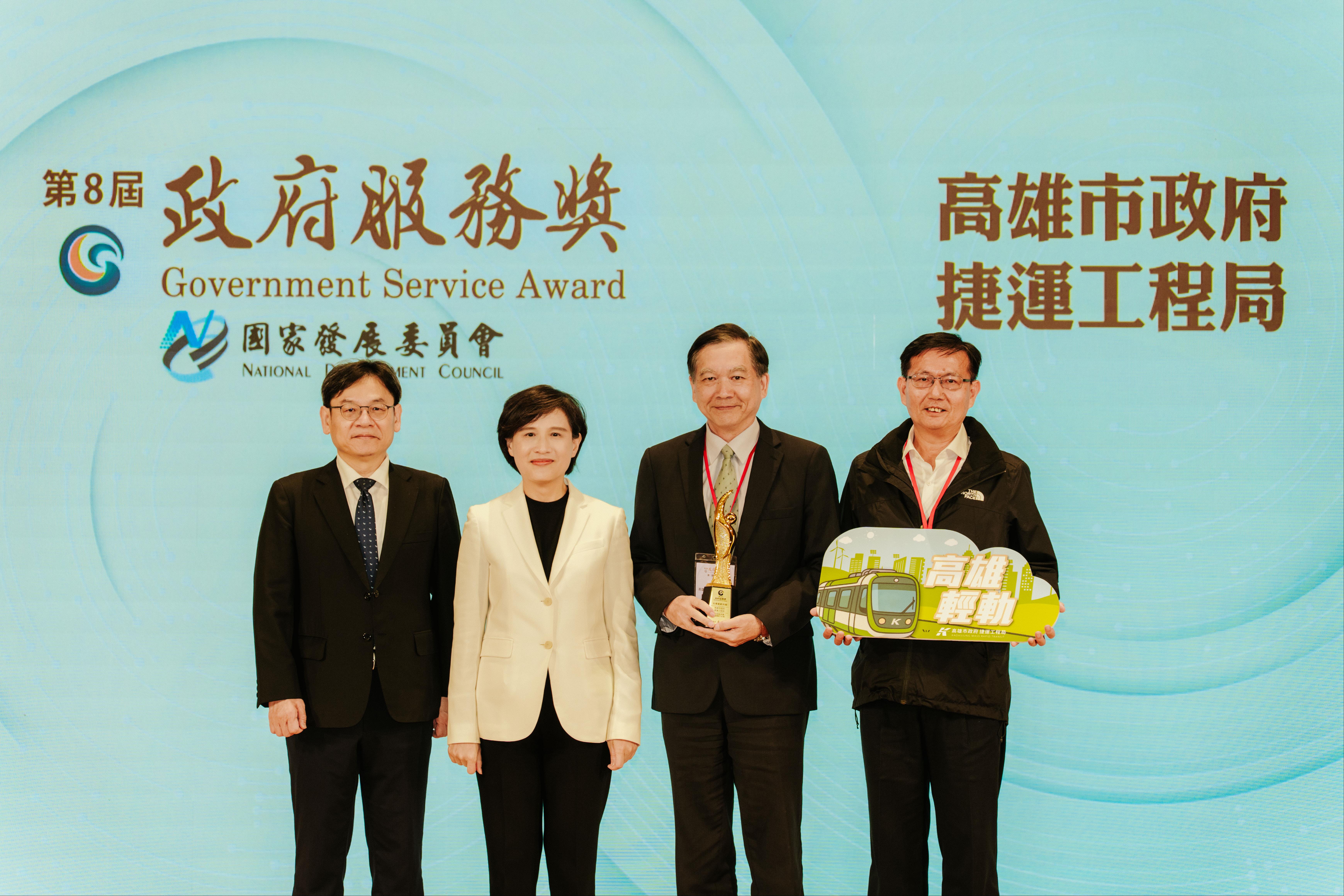 全國共 144 個機關參與角逐,高雄市捷運局是唯一獲獎的軌道建設機關,這份榮耀不僅是對高雄輕軌營運成果的最高肯定,更是彰顯高雄市府將大眾運輸系統與城市發展、社會福祉完美結合的典範。輕軌的成功,充分體現了高雄市「以人為本」的施政主軸,落實了全齡友善、環境永續,並有效促進社會資源衡平使用。