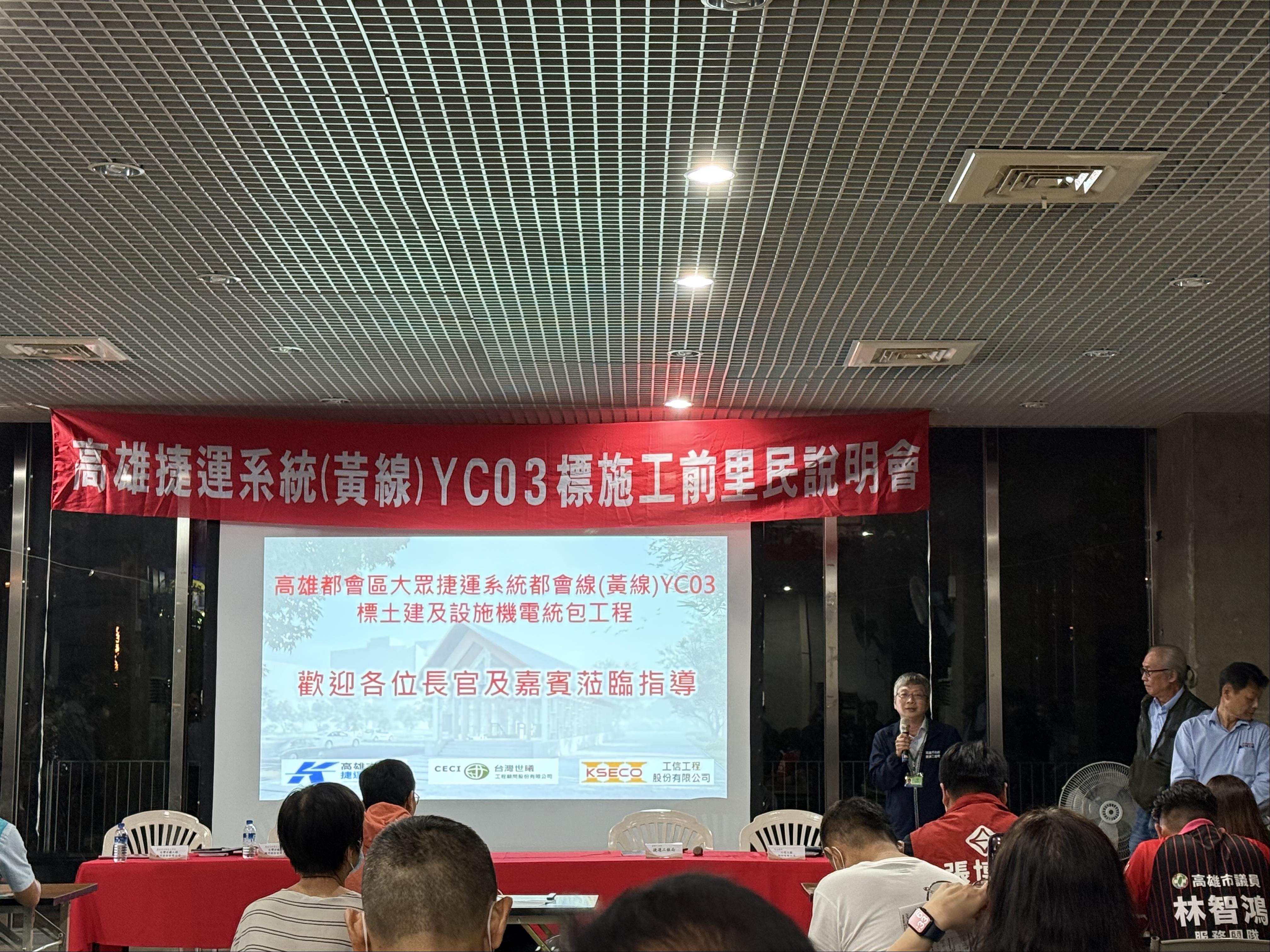 高雄捷運黃線預計於今(113)年11月正式進場施工,黃線YC03標統包商工信工程公司繼上週三(11/6)舉辦第一場施工前說明會後,接續於11/11於寶業滯洪公園生態教育推廣教室舉辦第二場施工前說明會,立委林岱樺、議員黃香菽、何權峰、邱俊憲以及沿線里長、居民及商家等均踴躍出席關心捷運建設。