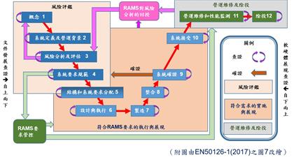 歐盟為增進軌道運輸單位與業界針對軌道系統保證作業溝通與管理效率,制訂EN50126/8/9系列標準,近年已成為國際標準,其中所述之系統保證作業可略分為文件設計與軟硬體實現兩大階段,即系統V型生命週期模型的左右兩臂。左臂由上而下發展系統文件,將服務需求歸納成系統量能,然後配當到各層的模組化軟硬體,右臂由下而上整合系統實體,從零組件、次系統、到系統的製造、安裝、測試及整合,按部就班,除了取得確切數據證明各層級符合設計需求,最後還需進行系統功能展現。