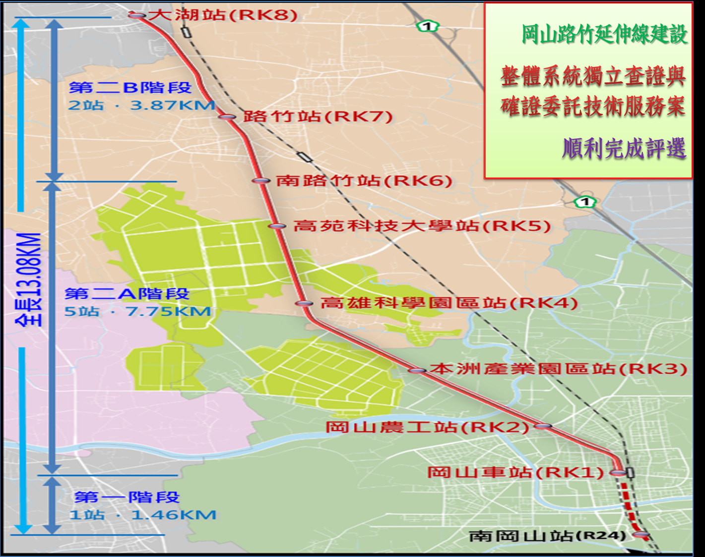 接續日前「高雄都會區大眾捷運系統岡山路竹延伸線RKM01標機電系統統包工程案」順利評選出最有利標廠商團隊,本局於 11/24 在學者專家評選委員協助下,順利評選出「高雄都會區大眾捷運系統岡山路竹延伸線整體系統獨立查證與確證委託技術服務案」優勝廠商,未來該技術服務廠商將負責岡山路竹延伸線整體系統之查證與確證工作,確保土建工程與機電系統各統包團隊未來完成興建之岡山路竹延伸線整體捷運系統,能具備高品質的可靠度、可用度、可維修度及安全性(RAMS),以提供舒適、安全、便捷的大眾運輸服務,為未來高雄科技路廊蓬勃發展奠立穩固基礎。