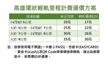 - 高雄市政府「輕軌暖心便民搭乘措施」持續實施:凡持本市博愛卡(身障人士)、敬老卡身分的民眾,進出站仍要刷卡,且即可「免費」搭乘高雄輕軌,歡迎多加利用。