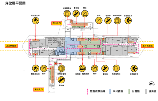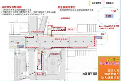 三、搶救通道:當火災或緊急事件發生時,消防搶救人員除從出入口進行搶救外,因車站穿堂層、月台層外牆上部皆為裸空通風區,亦可採用消防雲梯車升降至穿堂層緊急救援平台及逃生梯進入車站搶救。