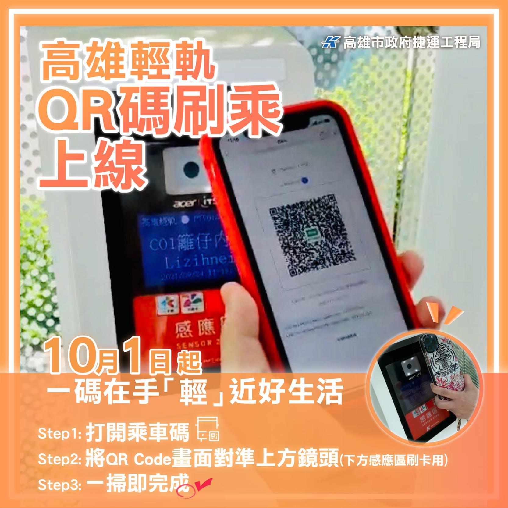 搭乘高雄輕軌除可使用電子票證及現場購票(紙票)外,即日起使用QR Code乘車碼也可輕鬆搭車囉。