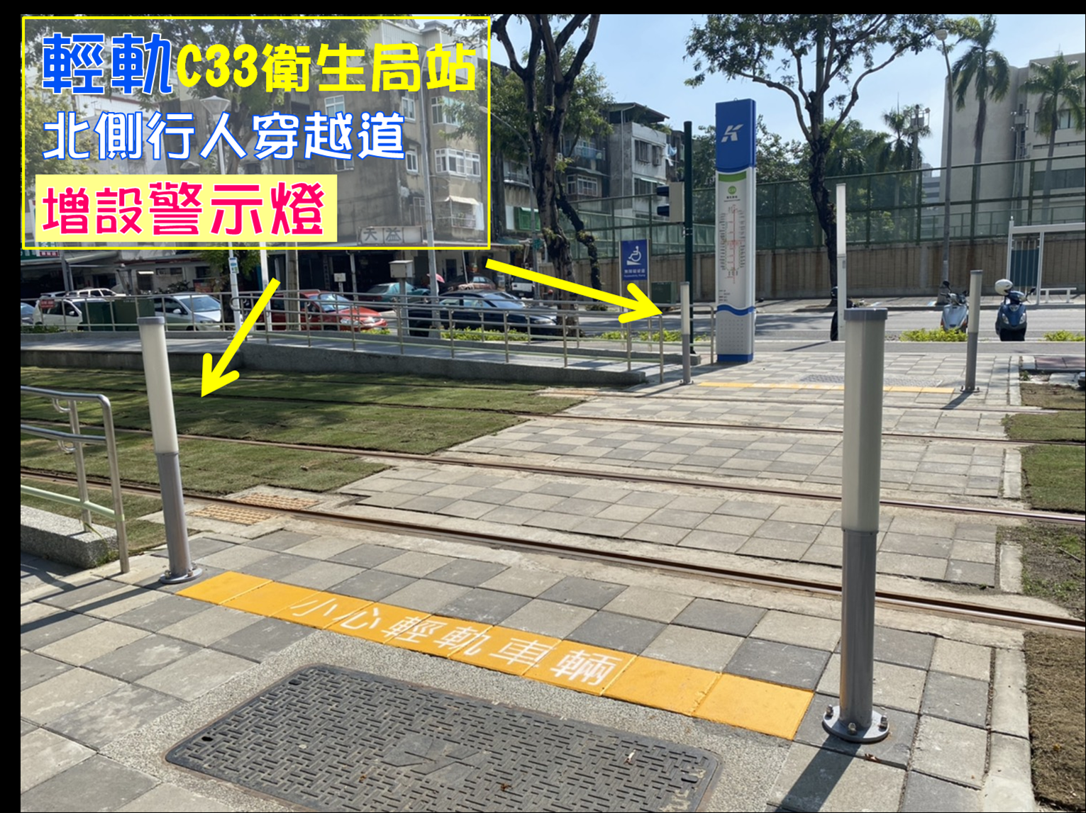 惟輕軌C33衛生局站因緊鄰民生、凱旋等多家醫院,為增加這區塊年長或行動不便者穿越軌道之安全性,捷運工程局於C33衛生局站北側行人穿越道試辦增設警示燈,當輕軌列車接近路口前以閃燈警示行人注意,避免擦撞意外發生,後續將持續觀察警示燈成效,研議是否於其餘重點輕軌車站行穿道增設相關設備。