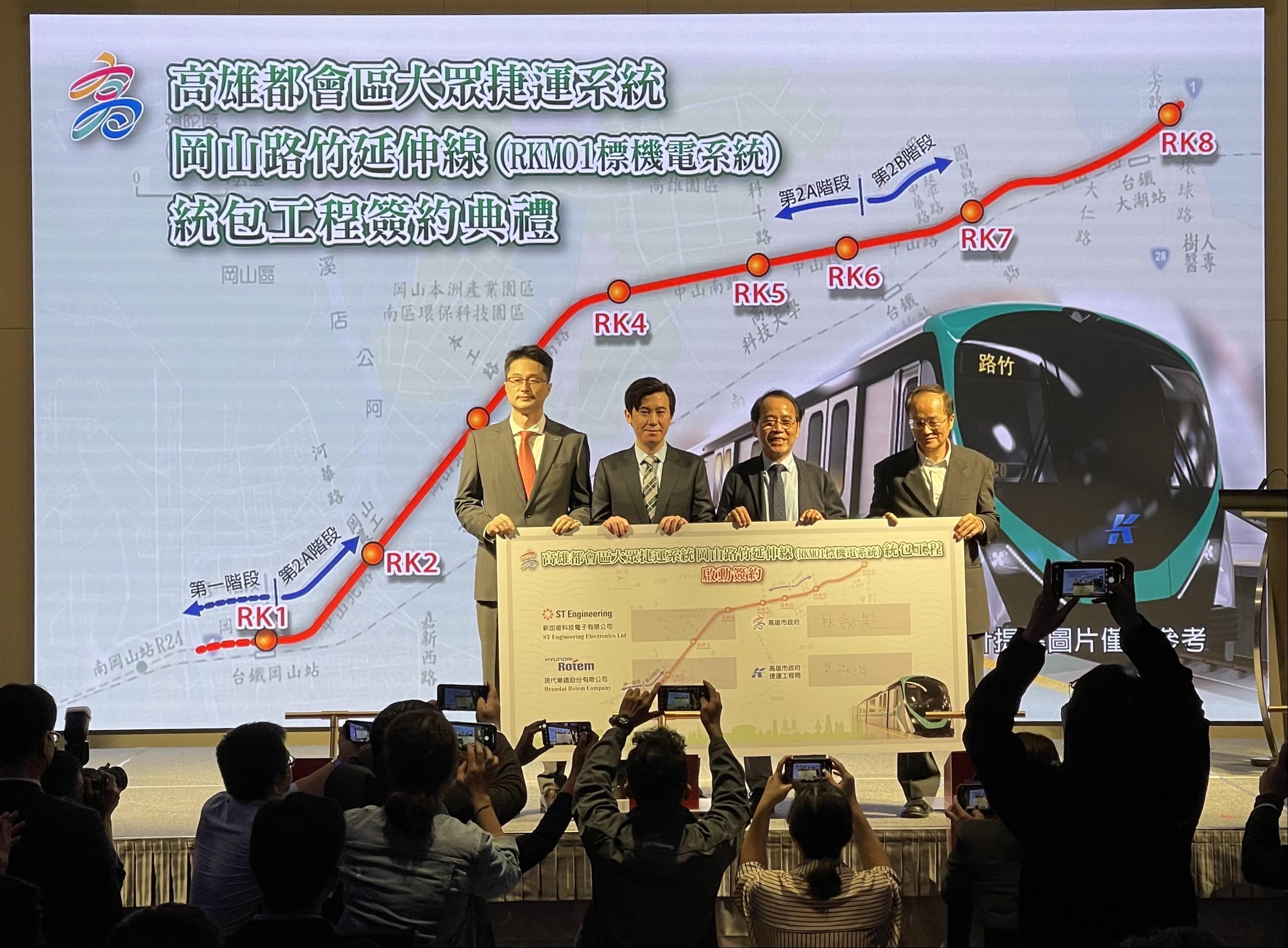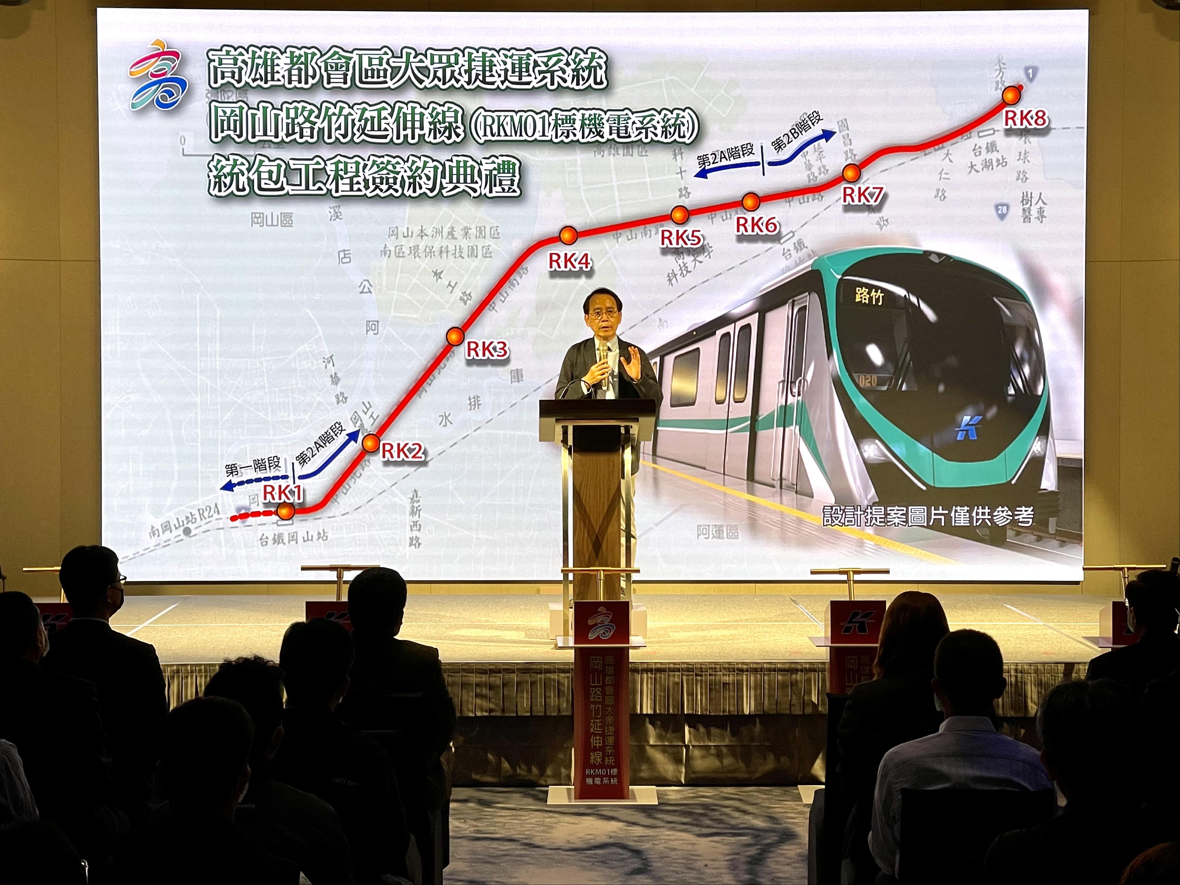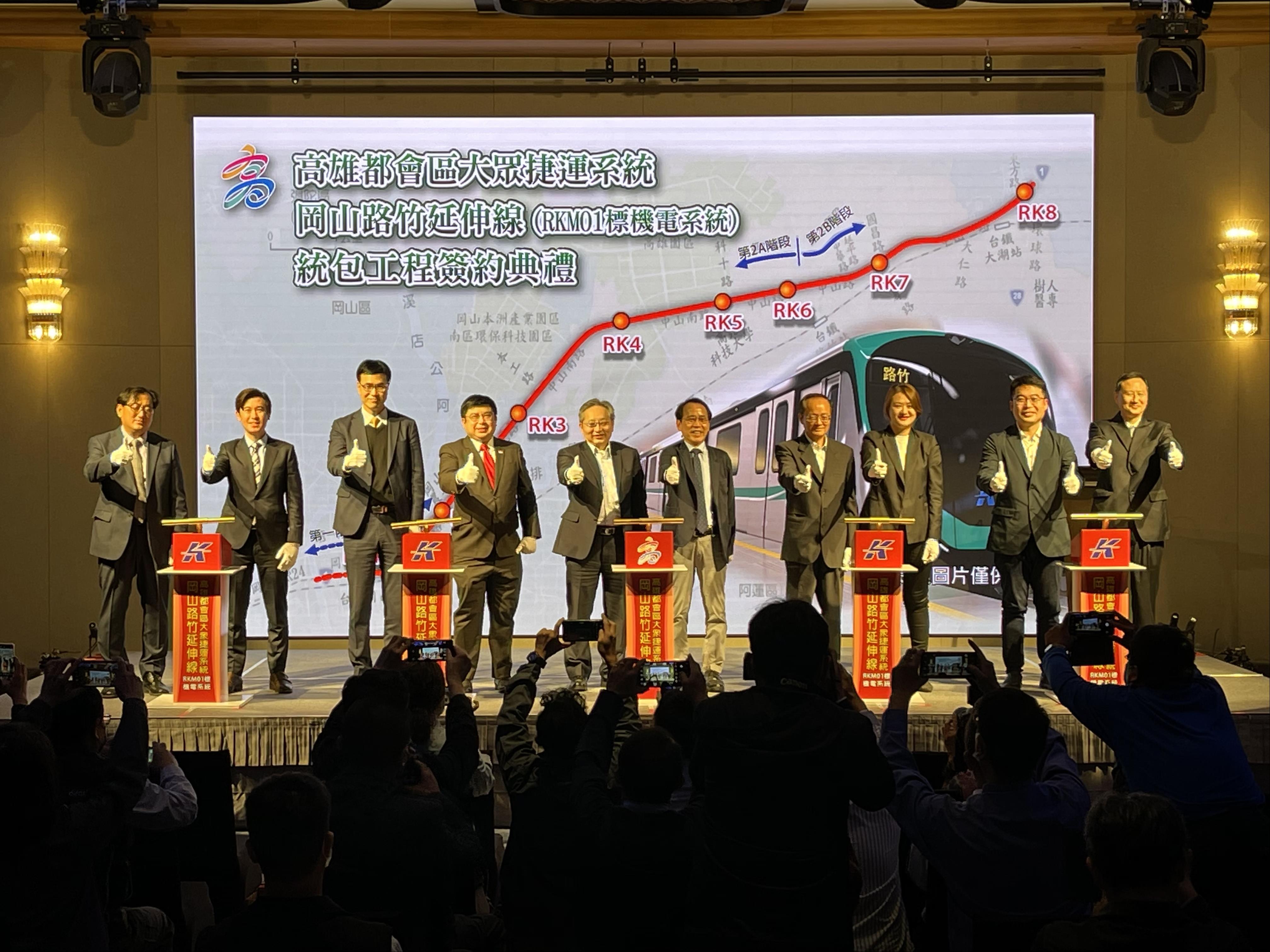 「捷運系統岡山路竹延伸線機電系統工程」正式啟動。高雄市各界及市民關心期待之高雄都會區大眾捷運系統岡山路竹延伸線已於今年10月29日完成 RKM01標機電系統統包工程案採購評選,由新加坡科技電子有限公司與韓國現代樂鐵有限公司共組團隊得標。