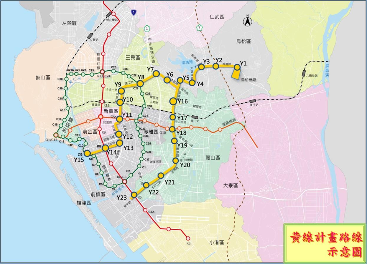 高雄都會區大眾捷運系統都會線(黃線)計畫路線為一倒Y字形,分為建工民族路段及澄清五甲路段,路線行經高雄市鳥松、三民、鳳山、苓雅、新興及前鎮區等6個行政區域,全線長度含地下段 21.85km與高架段0.92km,總長22.77km;高架車站1座與地下車站22座,總計23座車站;以及1座五級維修機廠(鳥松機廠)與3座主變電站。