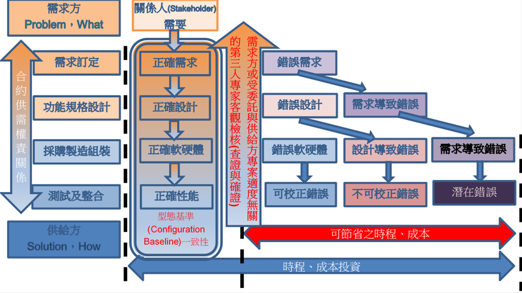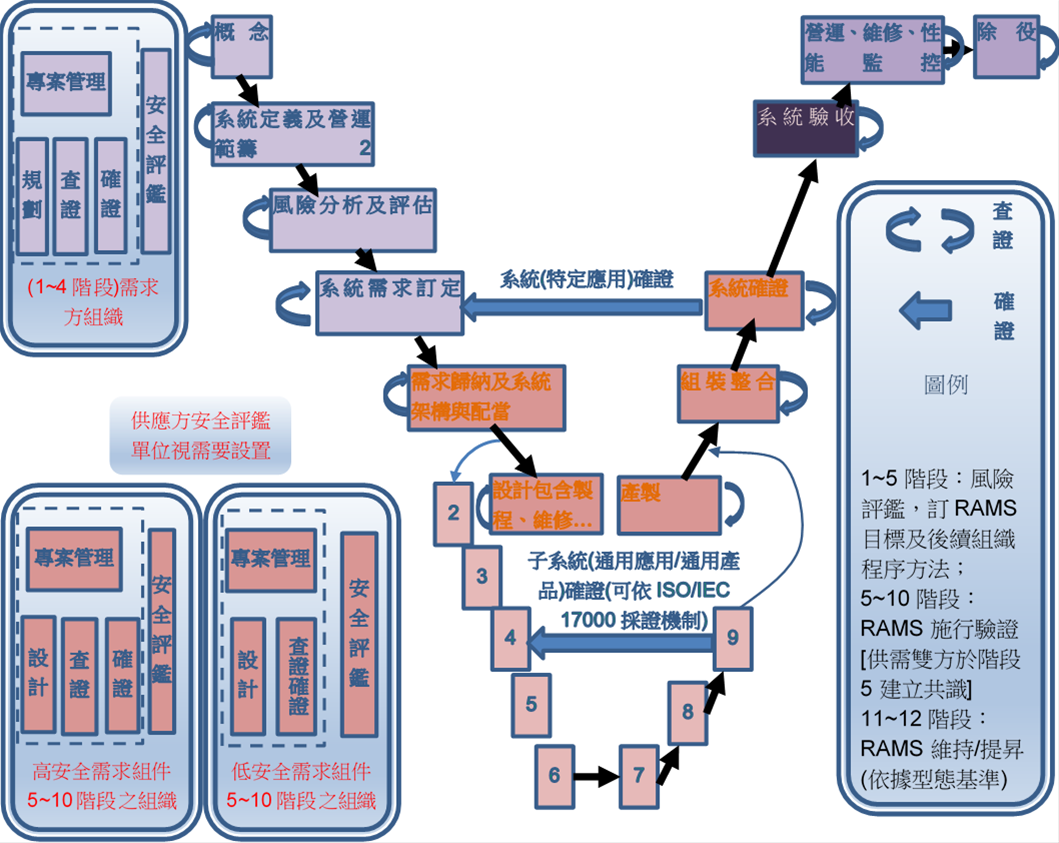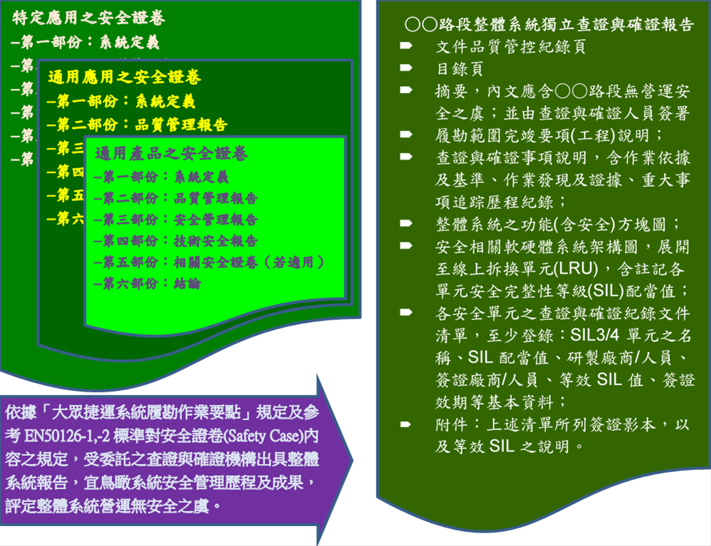 依據「大眾捷運系統履勘作業要點」規定,於初勘前須提出整體系統之獨立查證與確證(Verification and Validation)報告,佐證擬通車營運路段無營運安全之虞。查證與確證作業係依據歐洲/國際軌道運輸系統EN50126/IEC62278、EN50128/IEC62279、EN50129/IEC62425標準辦理;為去蕪存菁落實建設專案的特定需求,於系統的文件開展和軟硬體實現等12個構成V-型生命週期階段上,客觀取得貫串環節的定性、定量證據並予評估,而於通車營運前彙總完整詳實的安全評鑑報告;經由可追溯的系統型態基準紀錄,增益關心建設大眾對系統在期望使用壽期中穩健發揮協同運轉性能的信心。