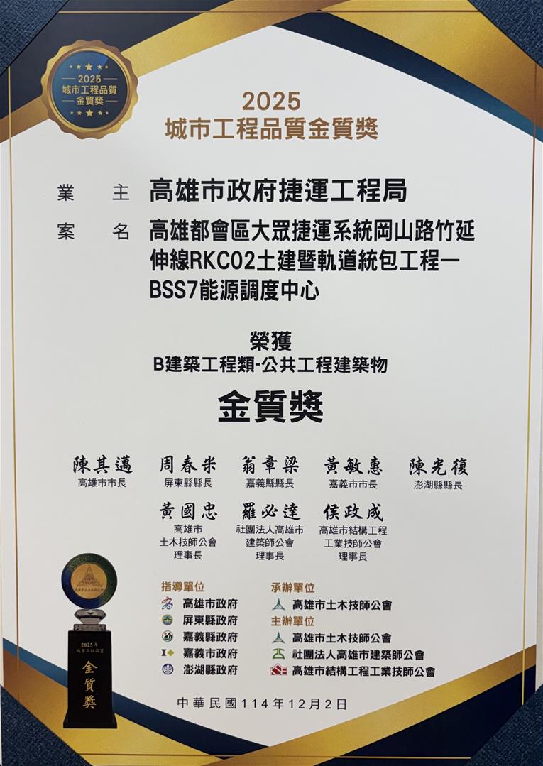 本局捷運岡山路竹延伸線BSS7能源調度中心工程,參加高雄市土木技師公會舉辦之114年城市工程品質評比,及本府環保局舉辦之優良營建工地評鑑,分別獲得「金質獎」及「優等獎」殊榮,感謝主辦單位、評比委員、各級長官指導評點及對BSS7能源調度中心工程品質之肯定!