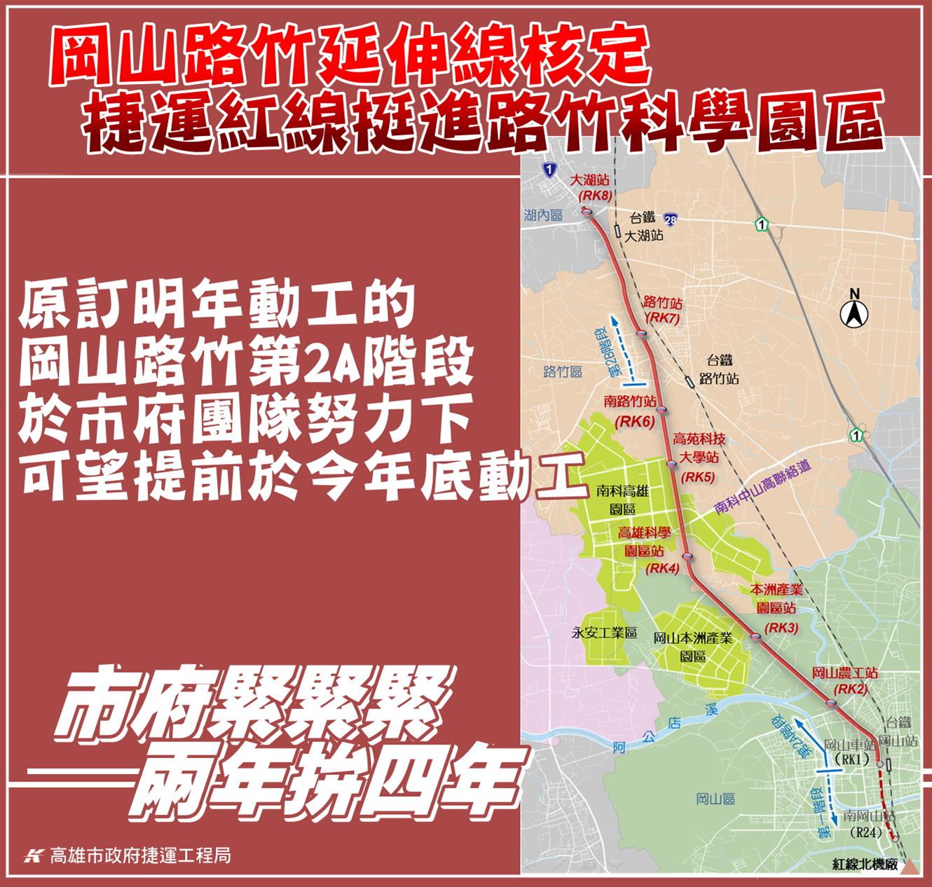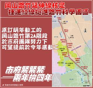 行政院於110年3月4日正式核定高雄市政府所報「高雄都會區大眾捷運系統岡山路竹延伸線暨周邊土地開發計畫」綜合規劃(第二A階段)暨可行性研究報告修正報告。