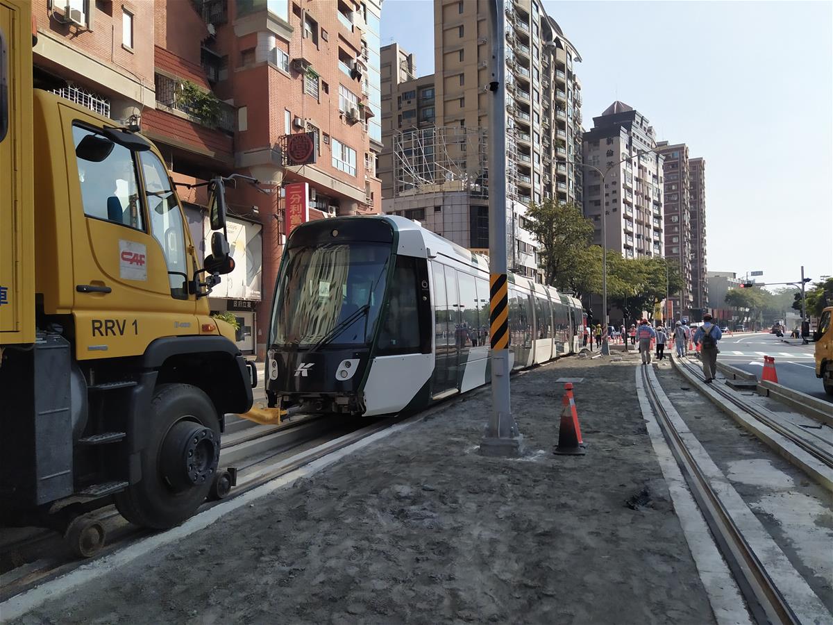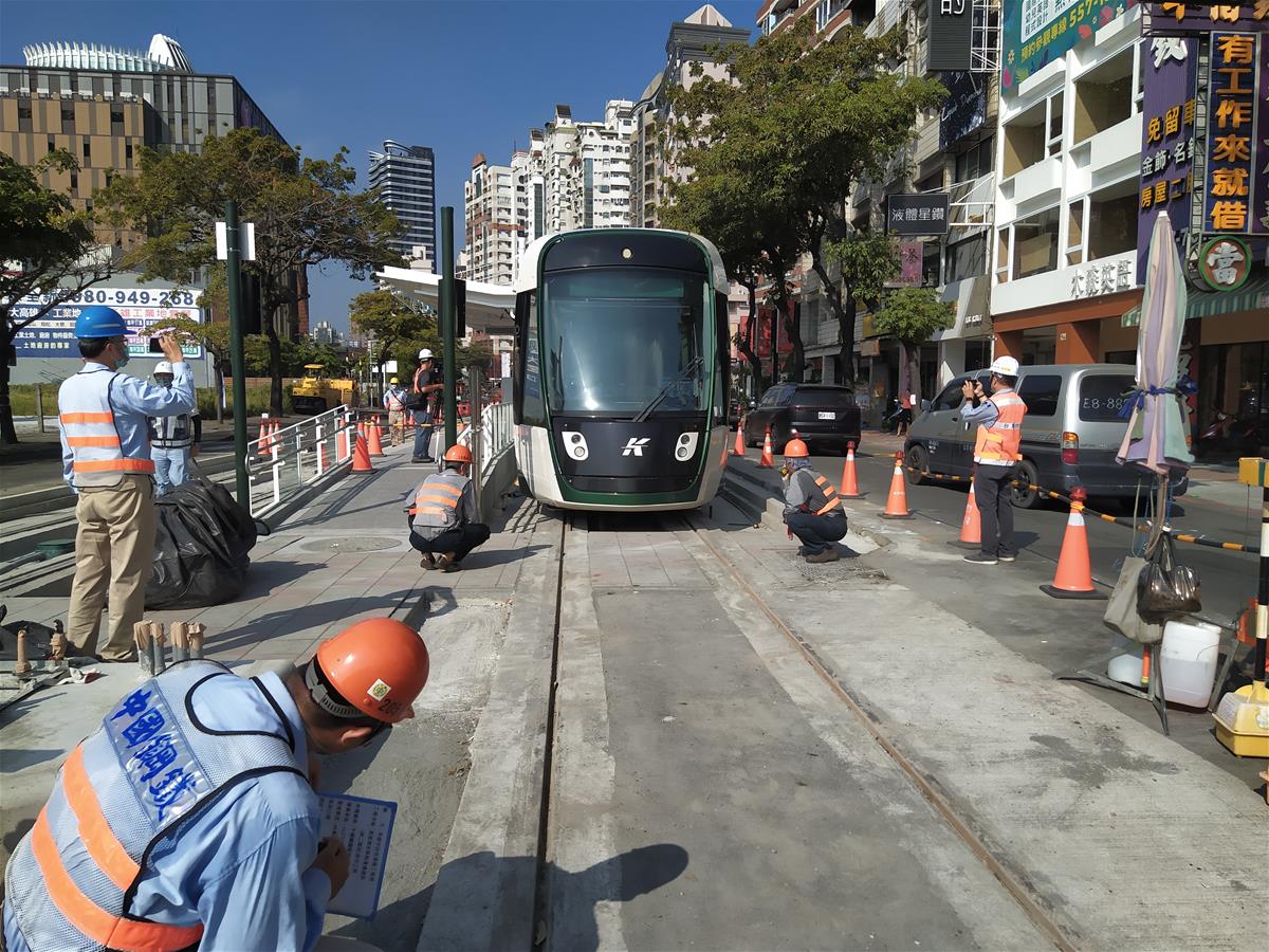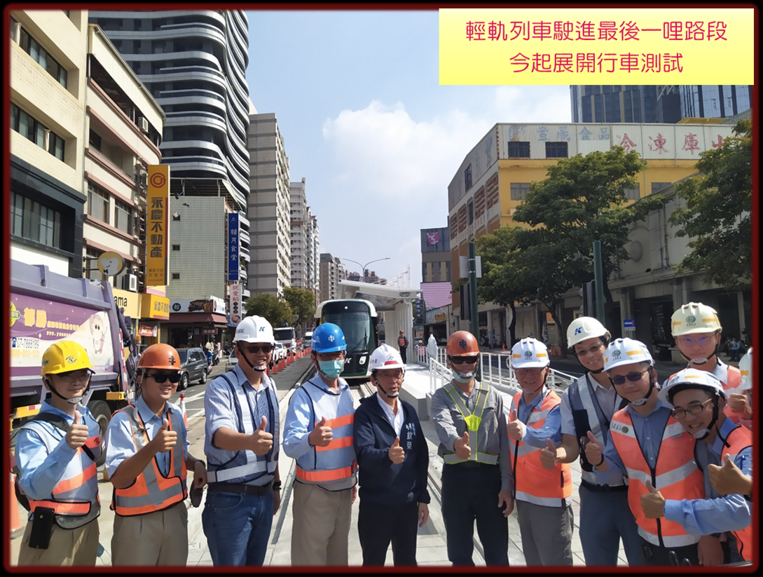 輕軌列車今日(11月2日)開始進入C24-C32大順路段(博愛路以東)展開行車測試。利用路軌兩用車聯結輕軌車輛推行(冷滑行)及輕軌列車慢速行駛(熱滑行)兩種方式先執行淨空檢查,檢測路線上軌道定線是否符合車輛行駛條件,以確保車體外圍不會和路線上任何物體碰觸造成損壞,能安全無虞的進行後續行車測試。林欽榮副市長特地親臨現場關切並慰勞施工人員辛勞,也期勉施工團隊持續努力積極推展工進,達成明年元旦後輕軌成圓通車試營運目標。
