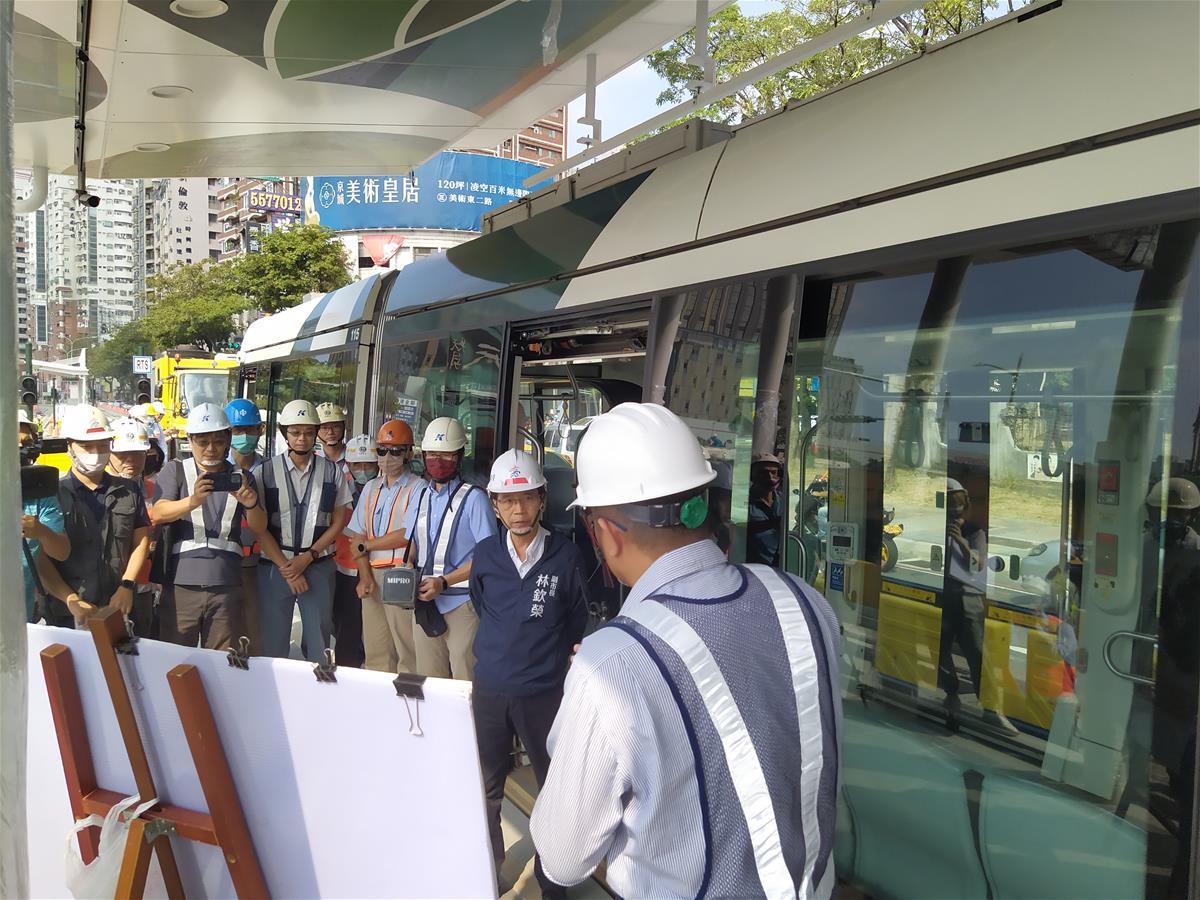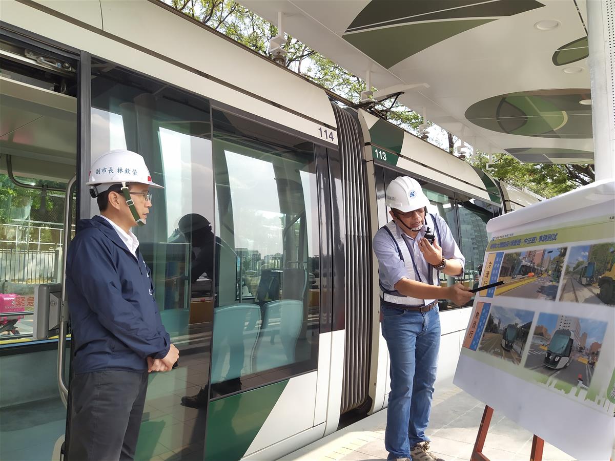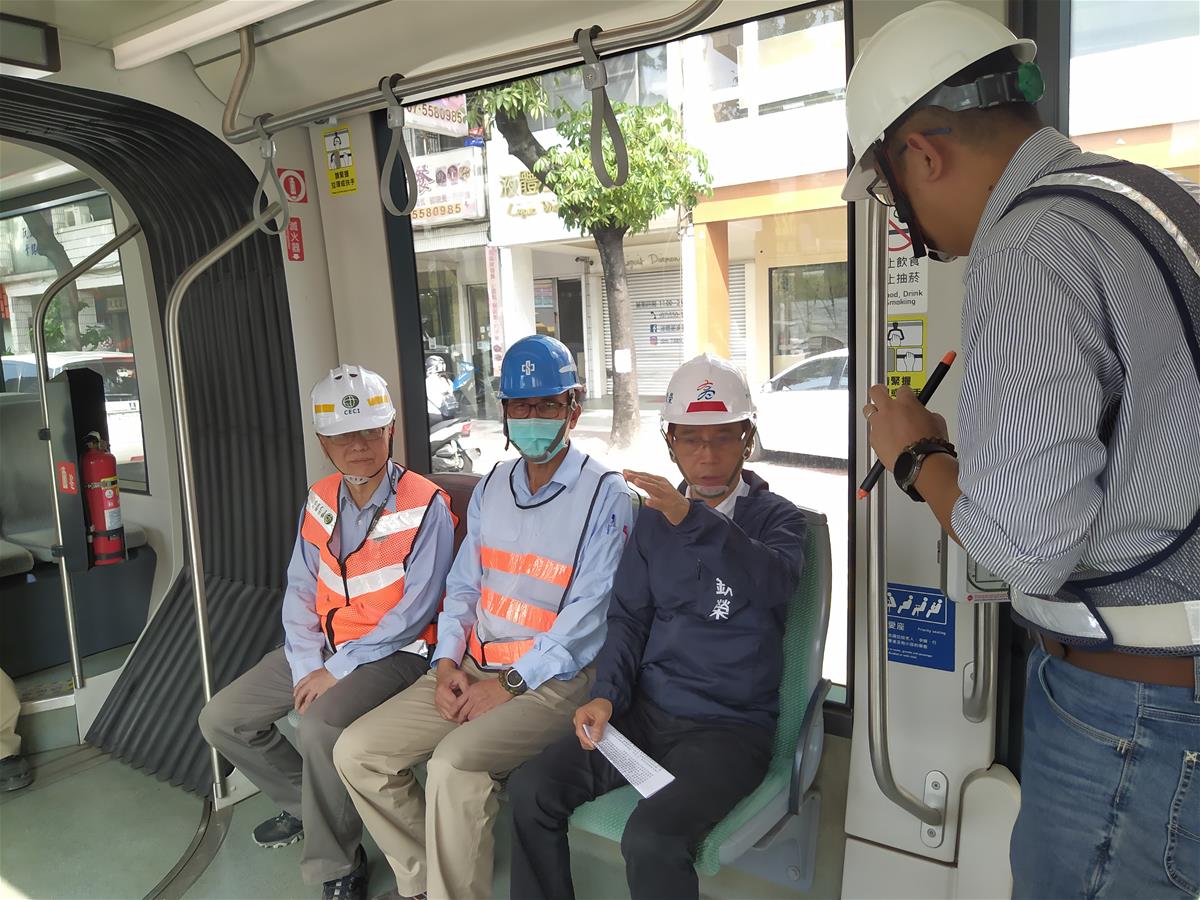 輕軌列車今日(11月2日)開始進入C24-C32大順路段(博愛路以東)展開行車測試。利用路軌兩用車聯結輕軌車輛推行(冷滑行)及輕軌列車慢速行駛(熱滑行)兩種方式先執行淨空檢查,檢測路線上軌道定線是否符合車輛行駛條件,以確保車體外圍不會和路線上任何物體碰觸造成損壞,能安全無虞的進行後續行車測試。林欽榮副市長特地親臨現場關切並慰勞施工人員辛勞,也期勉施工團隊持續努力積極推展工進,達成明年元旦後輕軌成圓通車試營運目標。