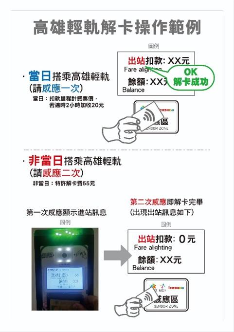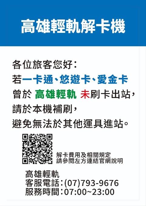 高雄輕軌服務再優化,針對外縣市旅客,因票卡進出站刷卡紀錄不完整而鎖卡者,高雄輕軌目前已在台中捷運的『高鐵台中站』和台北捷運的『台北車站淡水線(B3)』新增設解卡驗票機,歡迎多加利用喔~