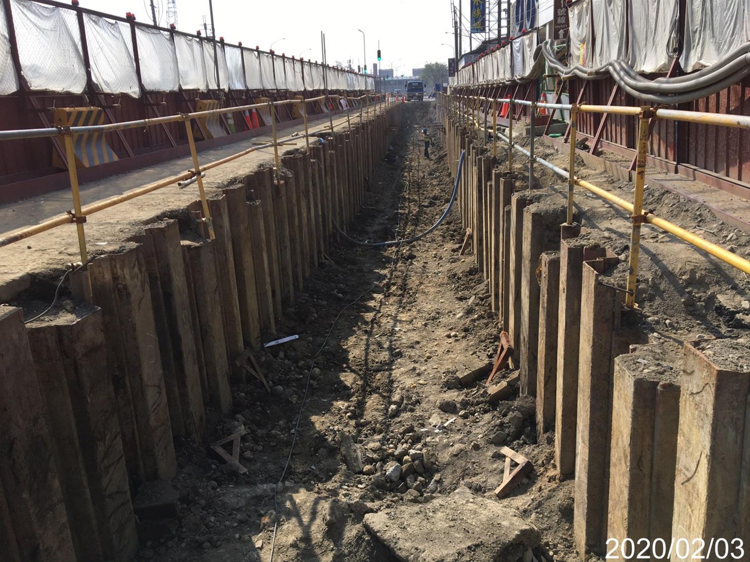 0218 鋼板樁支撐(第二階)對拉鋼索施工(北側鋼軌樁打設、型鋼架設)
