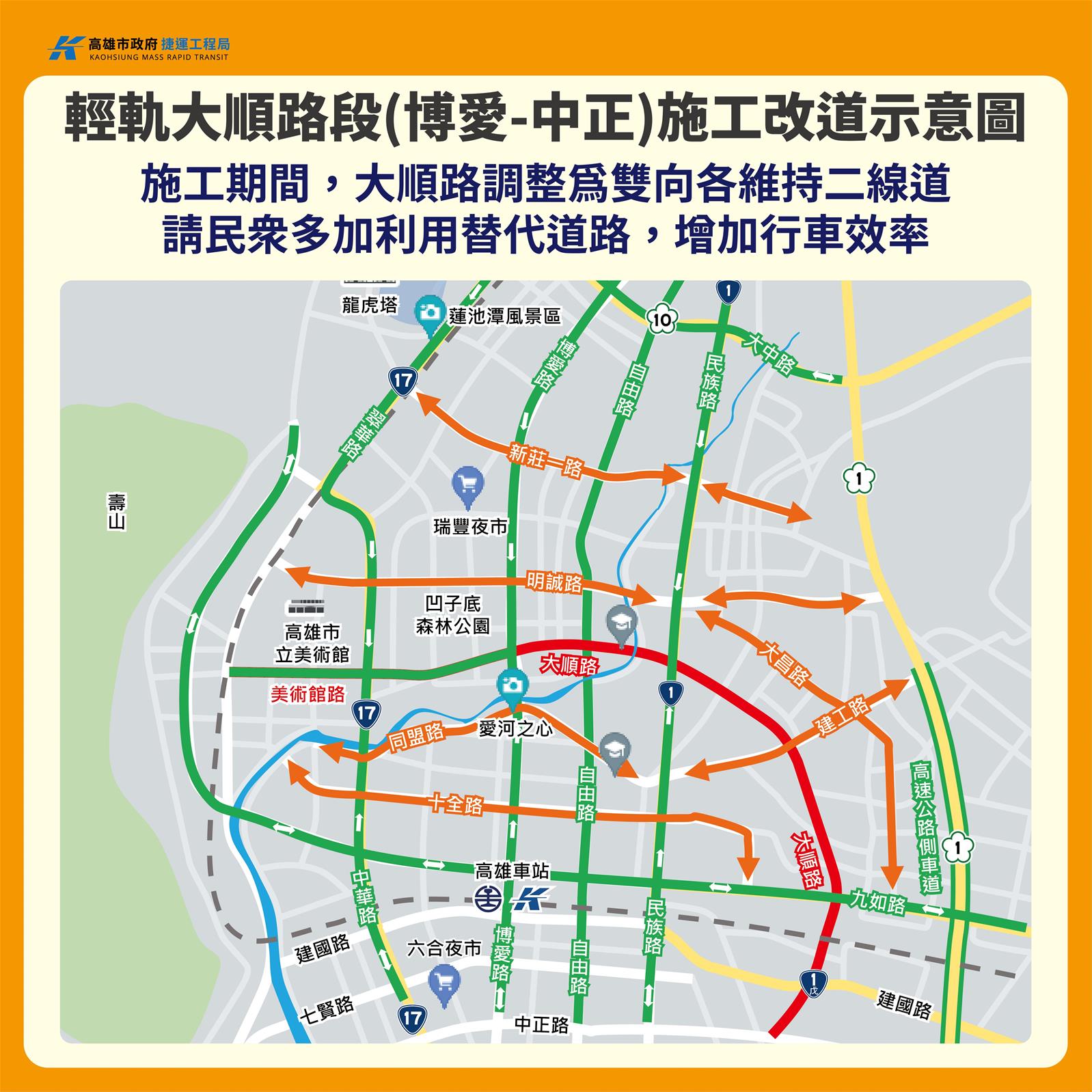 The MRT Bureau especially appealed that the public pay attention to the construction information in advance to protect its safety. When passing through those construction sections, drivers shall reduce their speed to 30 km/h (the speed limit in the work zone) and follow the traffic signs. It is recommended that pedestrians/drivers make use of the nearby east-west alternative roads (Mingcheng Road, Tongmeng Road, Jiangong Road, Shihcyuan Road and Jiouru Road) and the north-south alternative roads (Bo-ai Road, Zihyou Road, Minzu Road and Dachang Road) to be diverted earlier in order to save on the traveling time.